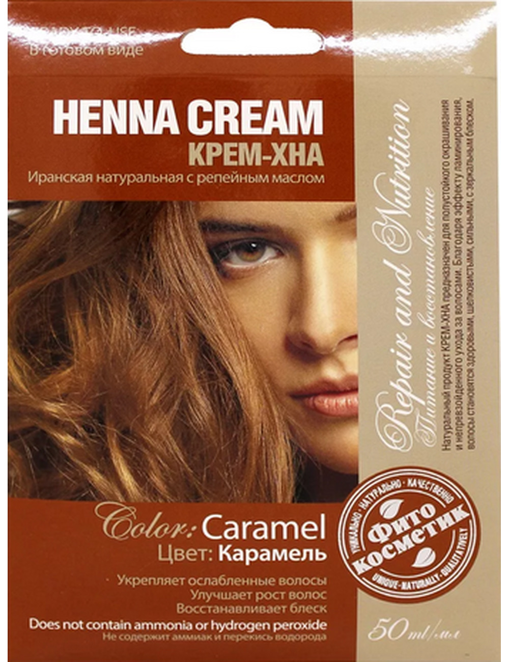 Инновационный прорыв в сфере окрашивания волос. Это натуральная природная краска, обогащенная репейным маслом, дарит волосам глубокий, сияющий цвет «Карамель», интенсивно питает, увлажняет, восстанавливает и оздоравливает их. Наполняет жизненной силой и энергией от корней до кончиков волос, придает ослепительный блеск и объем. Репейное масло усиливает капиллярное кровообращение в коже головы, питает и укрепляет корни и структуру волос. После использования крем-хны в готовом виде, волосы приобретают красивый насыщенный цвет, становятся более густыми, эластичными, упругими и шелковистыми и послушными.