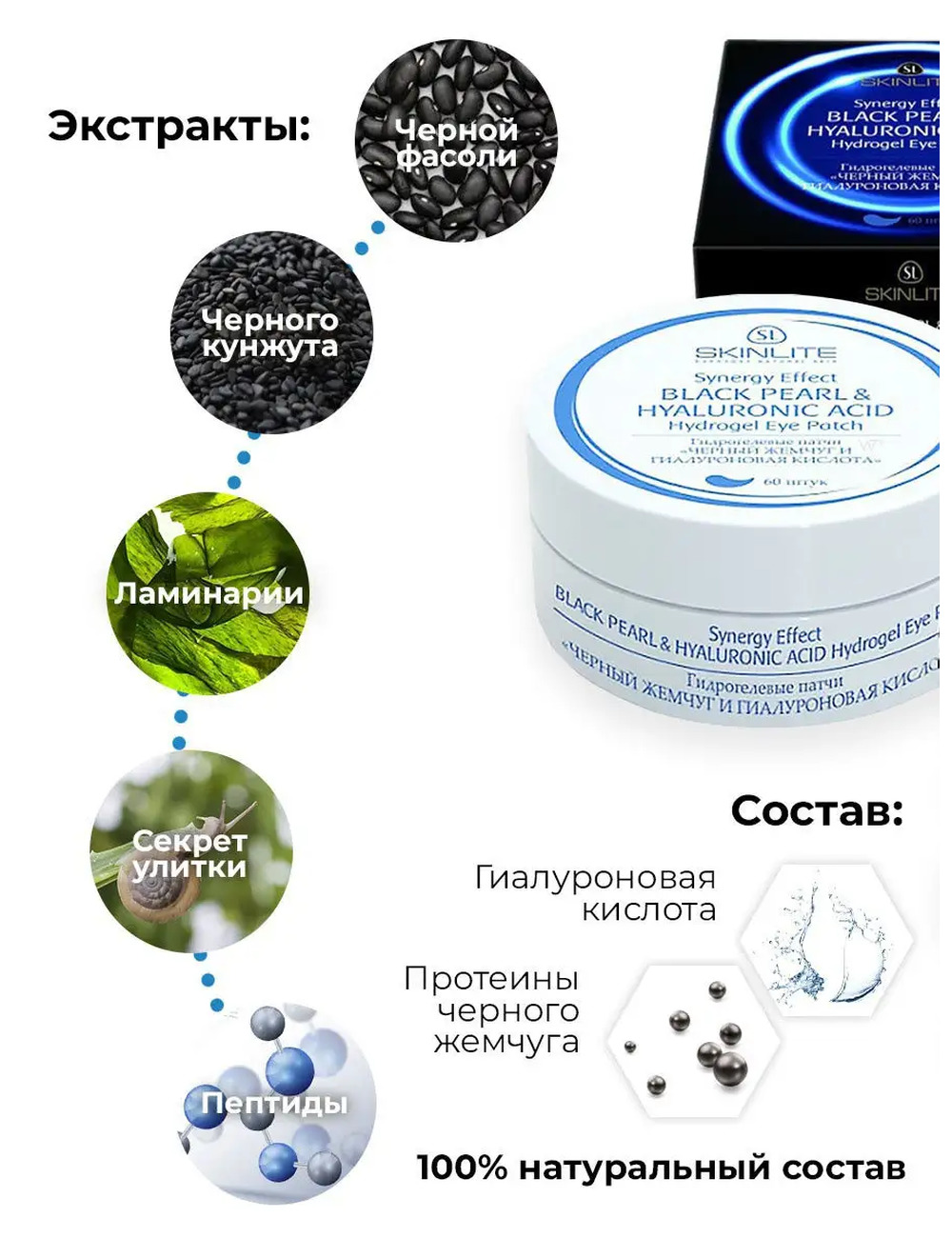 Патчи для глаз "Черный жемчуг и гиалуроновая кислота" от Скинлайт. Гиалуроновая кислота оказывает значительный эффект. Нежная кожа под глазами заметно укрепляется, уменьшаются морщины, исчезает дряблость, отеки и пропадают следы усталости, а взгляд становится выразительным и отдохнувшим. Уже после первой процедуры Вы заметите, как разгладились мелкие морщинки, спала отечность, а кожа стала гладкой и свежей. Маска от морщин разглаживает морщины, выравнивает рельеф кожи. Гидрогелевые патчи представляют собой невероятно эффективный и, в то же время, деликатный уход за нежной кожей под глазами. Специальная форма и структура патчей Скинлайт способствуют плотному прилеганию. Взаимодействие протеинов черного жемчуга с гиалуроновой кислотой обеспечивает эффективное увлажнение кожи, осветление пигментации, помогает устранить темные круги. Маска для глаз содержит уникальный комплекс компонентов из экстрактов черной фасоли, черного кунжута и ламинарии.