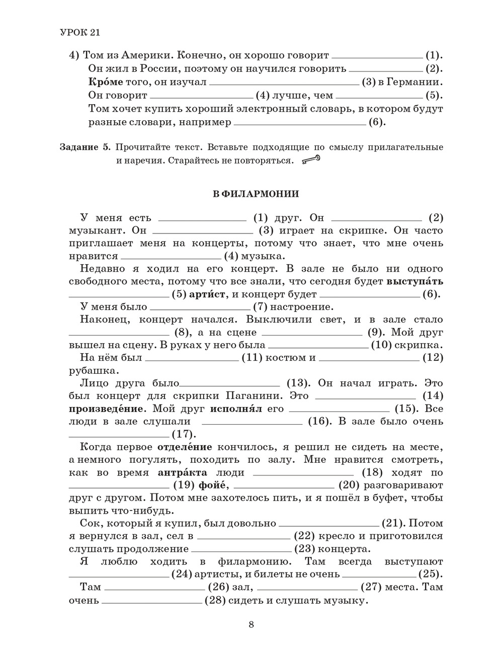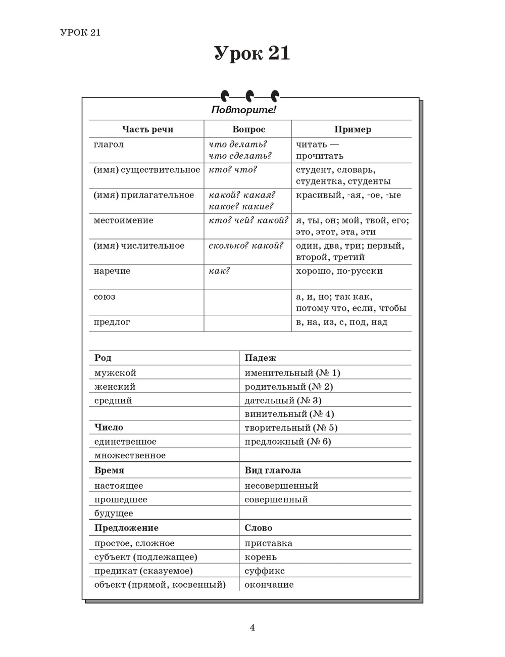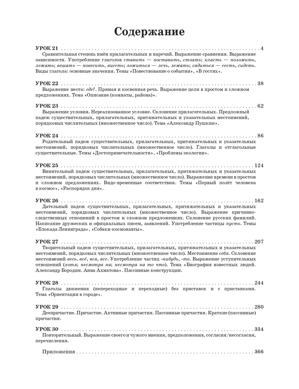 Пособие является завершающей частью учебного комплекса. Третья часть содержит 10 уроков (21-30, последний-повторительный). Усвоение лексико-грамматического материала рассчитано примерно на 200-240 часов аудиторных занятий. Пособие содержит сведения о системе склонения существительных, прилагательных, местоимений, порядковых числительных множественного числа; о правилах употребления деепричастий и причастий, глаголов движения; о способах выражения пространственных, временных, причинно-следственных, условных, целевых, уступительных отношений. В конце представлены проверочные работы к каждому уроку и таблицы, которые помогут учащимся упорядочить знания по грамматике русского языка на данном этапе. Имеется аудиоприложение. Ключи к заданиям размещены на сайте издательства.