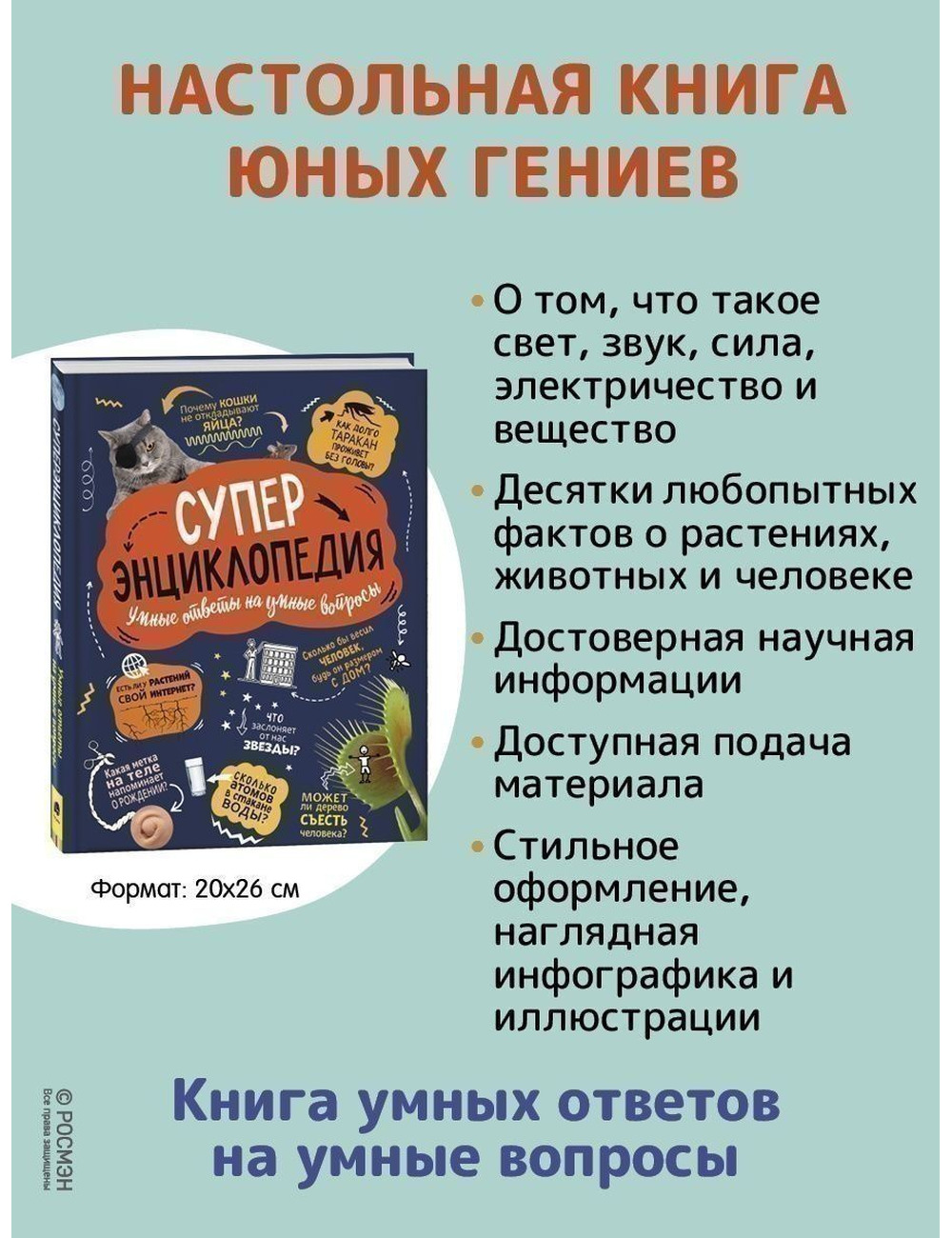 Наглядная современная энциклопедия ответов на самые популярные вопросы об окружающем мире. На простых примерах она объясняет многие природные явления и научные понятия из физики, химии, биологии, зоологии и анатомии. Каждая глава начинается с наивных на первый взгляд вопросов: может ли дерево съесть человека, зачем нам пупок, как кактусы выживают без воды?Прочитав "Суперэнциклопедию", подросток узнает: как человек различает цвета; почему яйца твердеют при нагревании; как хамелеоны меняют цвет; всегда ли кровь красного цвета; что такое сила, звук, свет, электричество, вещество и не только.Стильное оформление - современные фотографии в сочетании с ироничным рисованием - наглядно иллюстрирует объяснения ученых. Данное издание - яркий пример того, что обучение детей и развитие их эрудиции может быть очень увлекательным!Книга станет чудесным подарком и полезным дополнением к школьной программе, поможет развить интерес к научно-познавательной литературе и изучению окружающего мира.