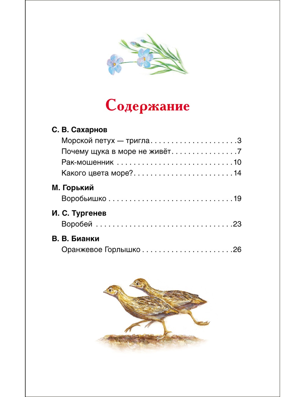 В сборник рассказов о природе вошли следующие произведения: М. Горький "Воробьишко", И. Тургенев "Воробей", В. Бианки "Оранжевое горлышко" и другие.