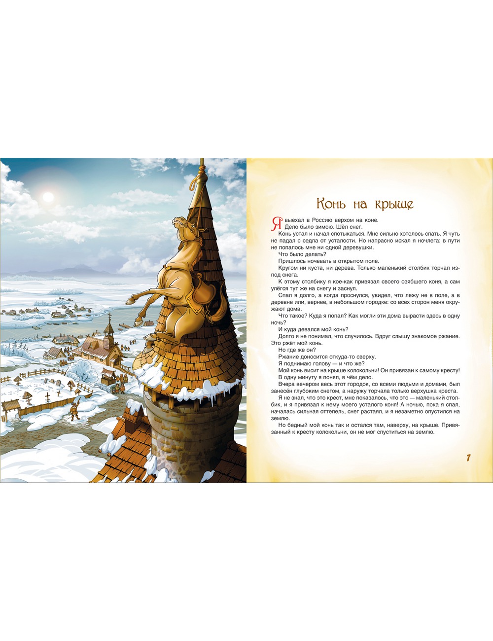 Барон Мюнхаузен – человек невероятно храбрый и находчивый, он найдет выход из любой ситуации: вытащит себя за волосы из болота, одолеет крокодила и льва и даже не побоится полететь на пушечном ядре. Мало кто верит в правдивость его рассказов, но вот уже больше двух столетий этот неунывающий герой остается любимцем детей и взрослых.