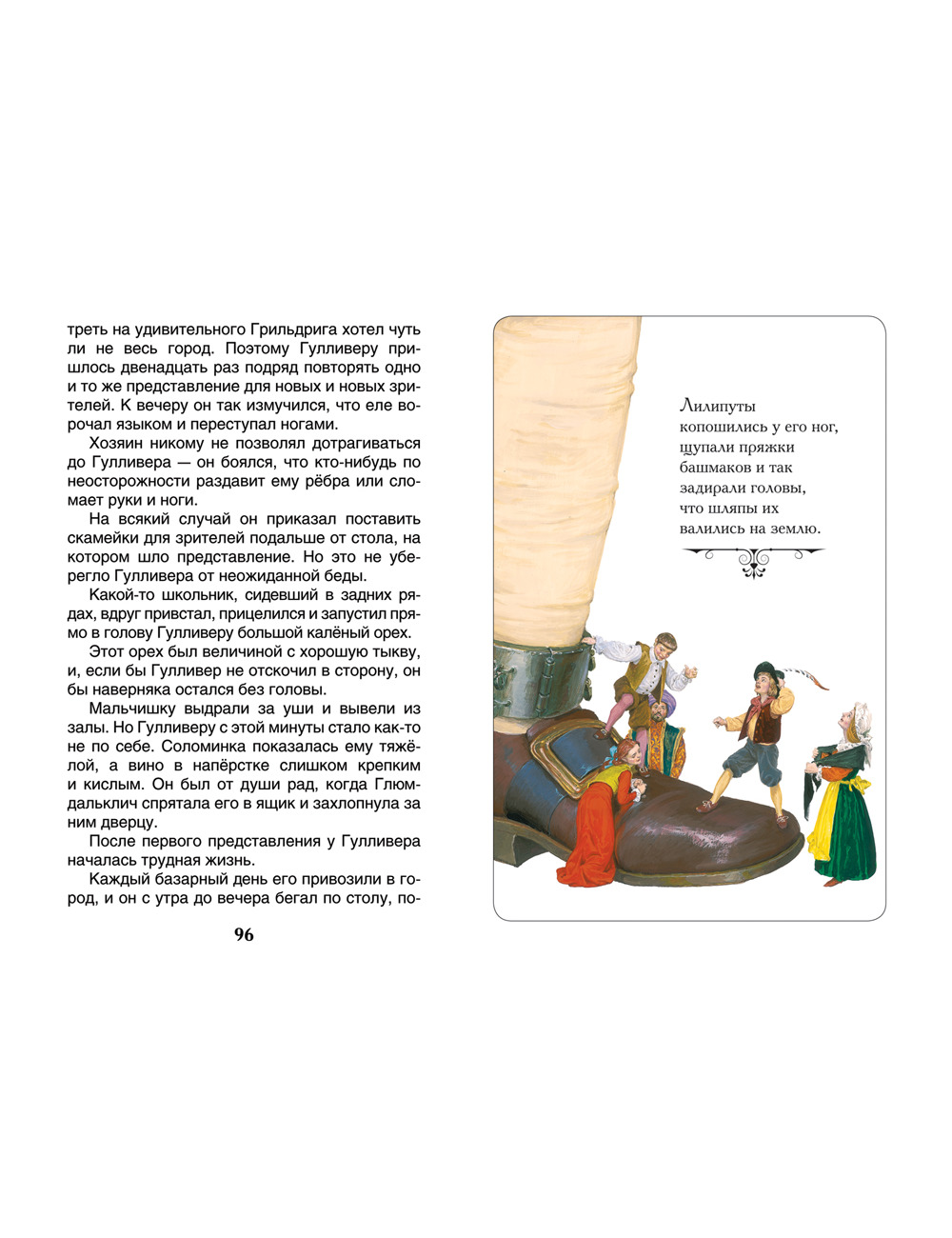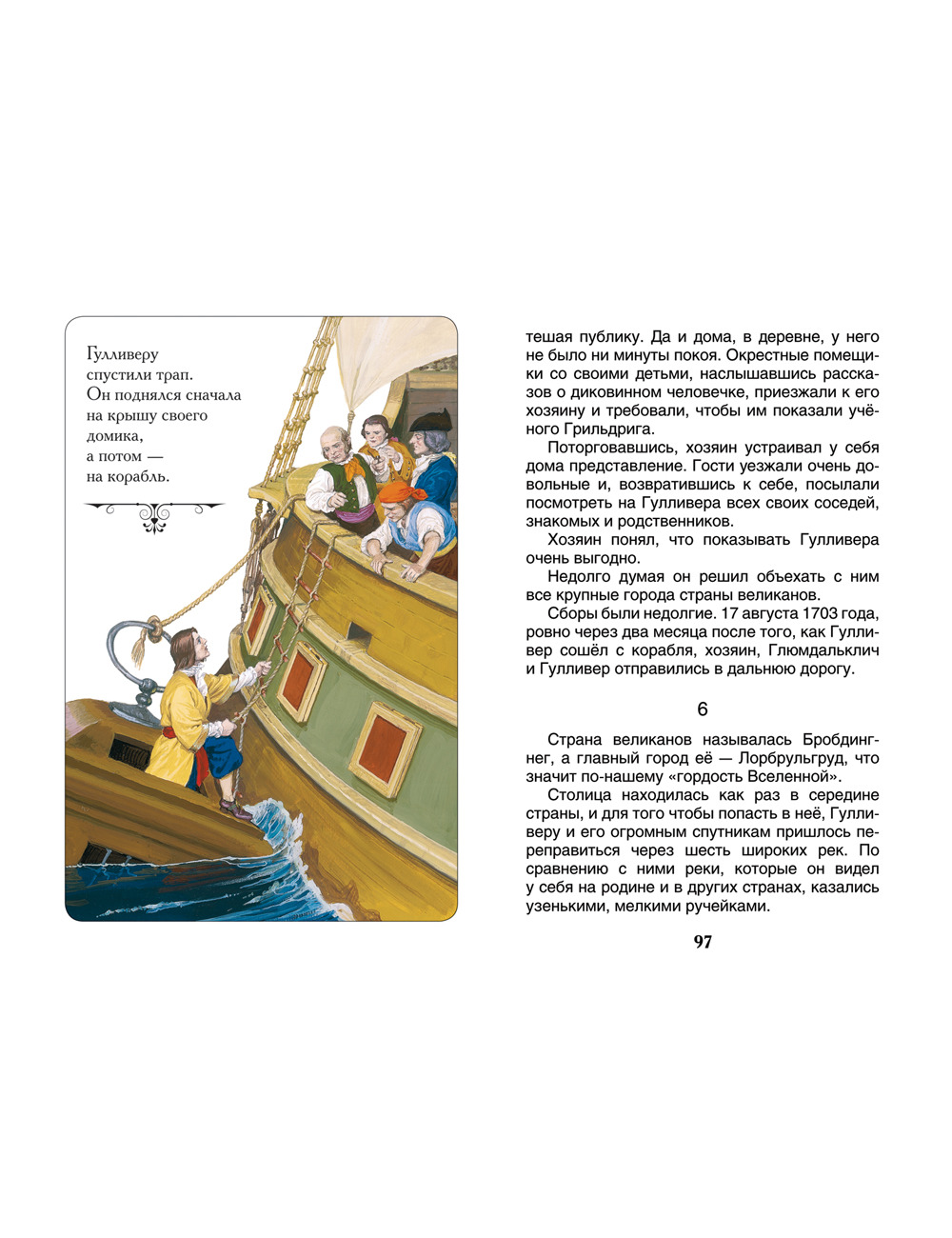 Знаменитая книга Джонатана Свифта об удивительных приключения Гулливера в стране лилипутов (первая часть романа) и в стране великанов (вторая часть).Пересказ Т.Габбе.