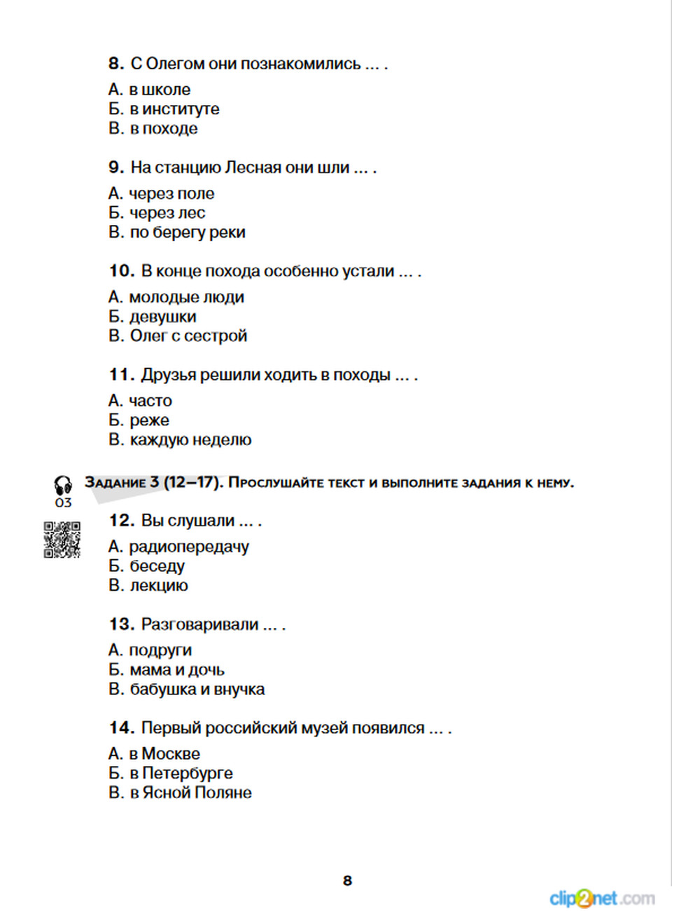 Тренировочные тесты по русскому языку как иностранному адресованы всем, кто, изучая русский язык, прошёл программу I сертификационного уровня и хочет подготовиться к сдаче тестов. Данное пособие можно использовать как при работе в аудитории с преподавателем, так и при самостоятельной подготовке к сдаче экзамена. Оно может быть использовано и в процессе обучения, и в качестве материалов текущего и итогового контроля. Предъявляемые в пособии материалы проходили апробацию в течение 3 лет в группах студентов-иностранцев, готовящихся к сдаче теста В1.