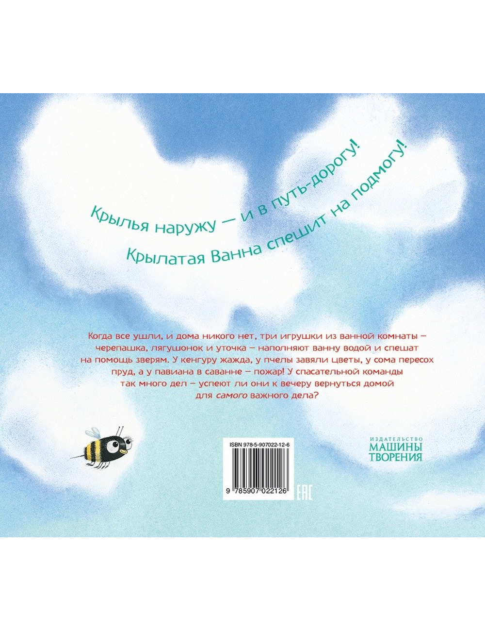 Крылья наружу - и в путь-дорогу! Крылатая Ванна спешит на подмогу! Когда все ушли, и дома никого нет, три игрушки из ванной комнаты - черепашка, лягушонок и уточка - наполняют ванну водой и спешат на помощь зверям. У кенгуру жажда, у пчелы завяли цветы, у сома пересох пруд, а у павиана в саванне - пожар! У спасательной команды так много дел - успеют ли они к вечеру вернуться домой для самого важного дела?