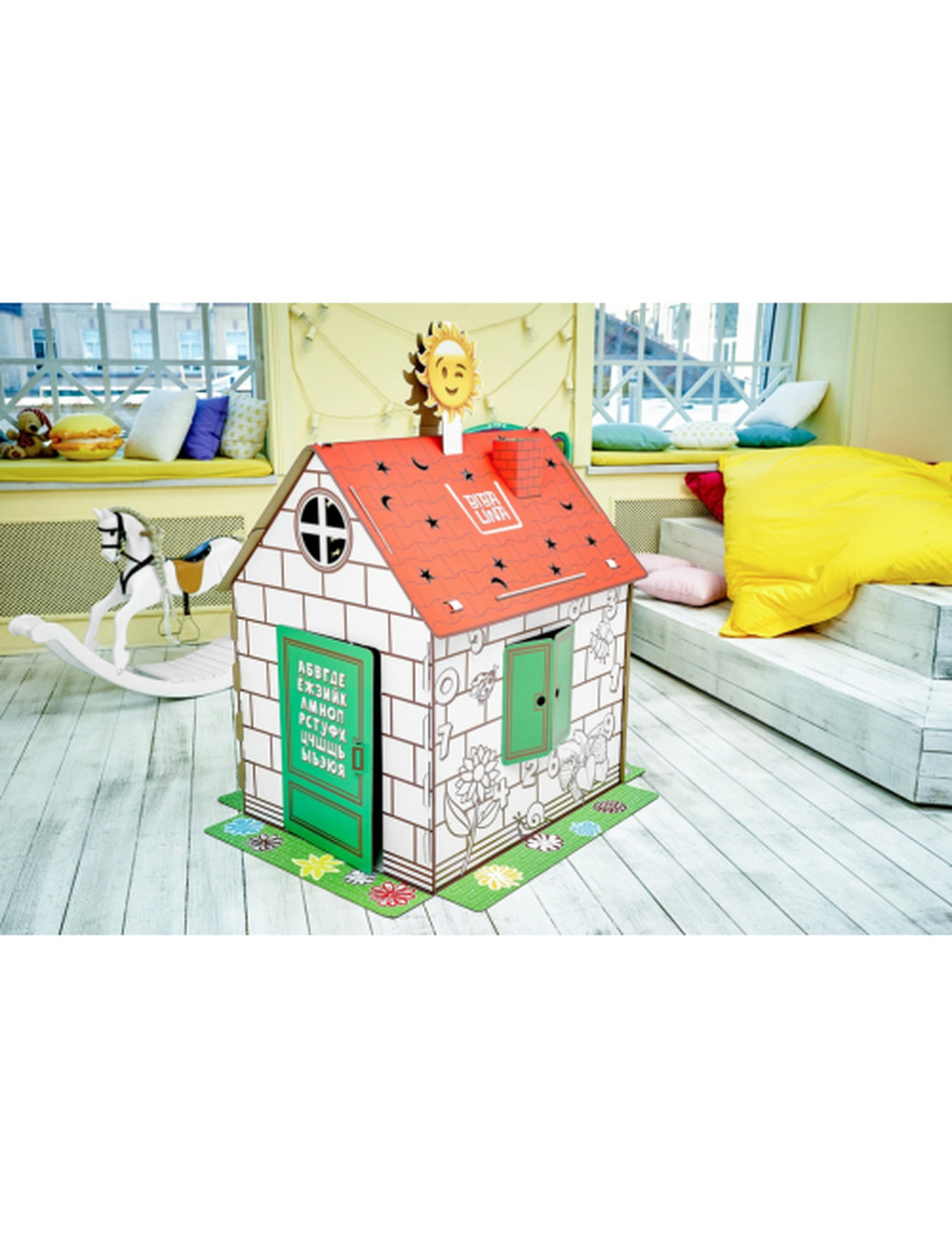 Домик изготовлен из безопасного, экологически чистого материала - гофрированного картона и состоит из 6 деталей, которые очень легко и просто собираются и крепятся между собой, без каких-либо вспомогательных средств! Поверхность домика легко красится любыми красками, карандашами, фломастерами, восковыми мелками.