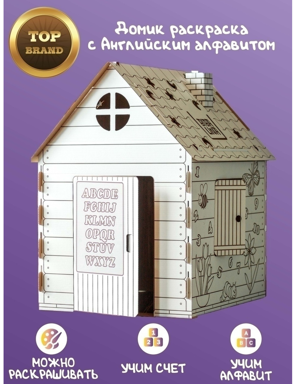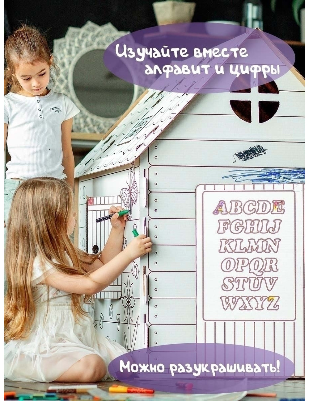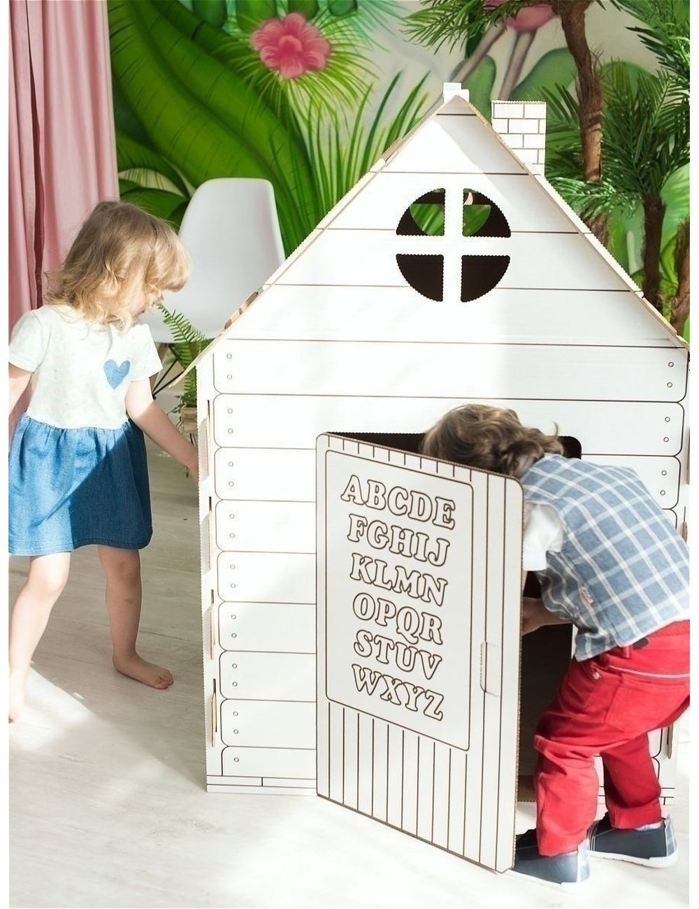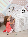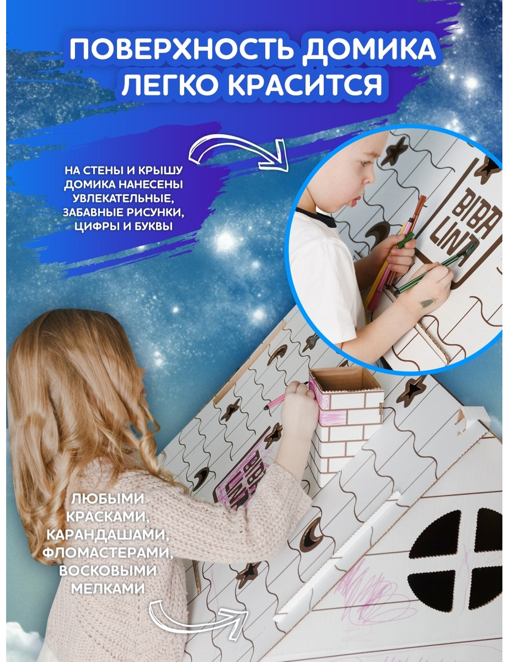 Домик изготовлен из безопасного, экологически чистого материала - гофрированного картона и состоит из 6 деталей, которые очень легко и просто собираются и крепятся между собой, без каких-либо вспомогательных средств! Поверхность домика легко красится любыми красками, карандашами, фломастерами, восковыми мелками.