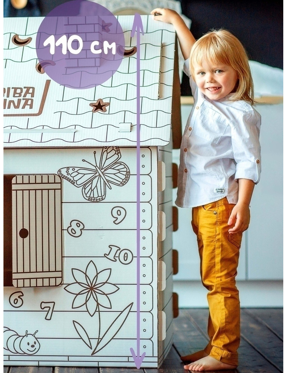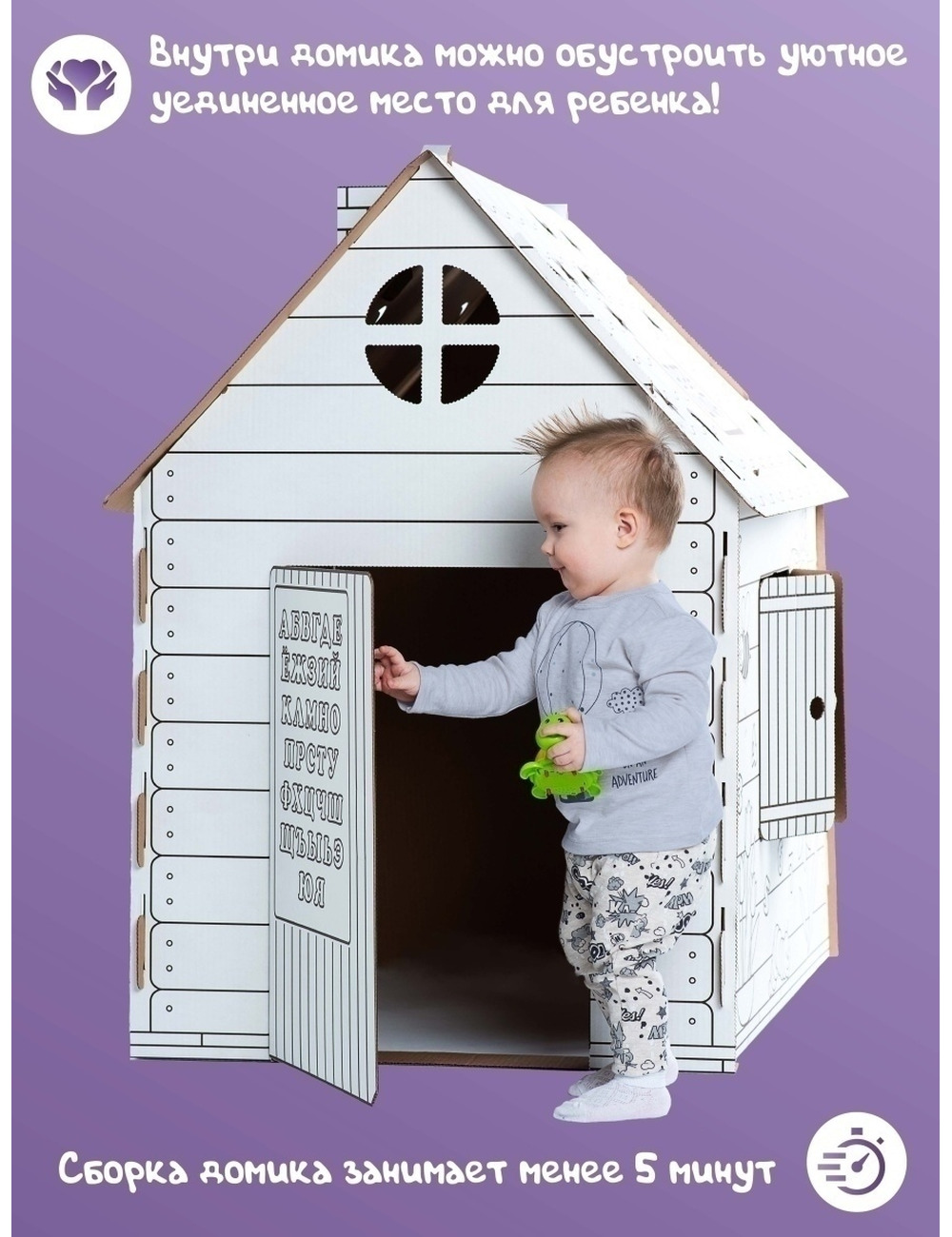 Домик изготовлен из безопасного, экологически чистого материала - гофрированного картона и состоит из 6 деталей, которые очень легко и просто собираются и крепятся между собой, без каких-либо вспомогательных средств! Поверхность домика легко красится любыми красками, карандашами, фломастерами, восковыми мелками.