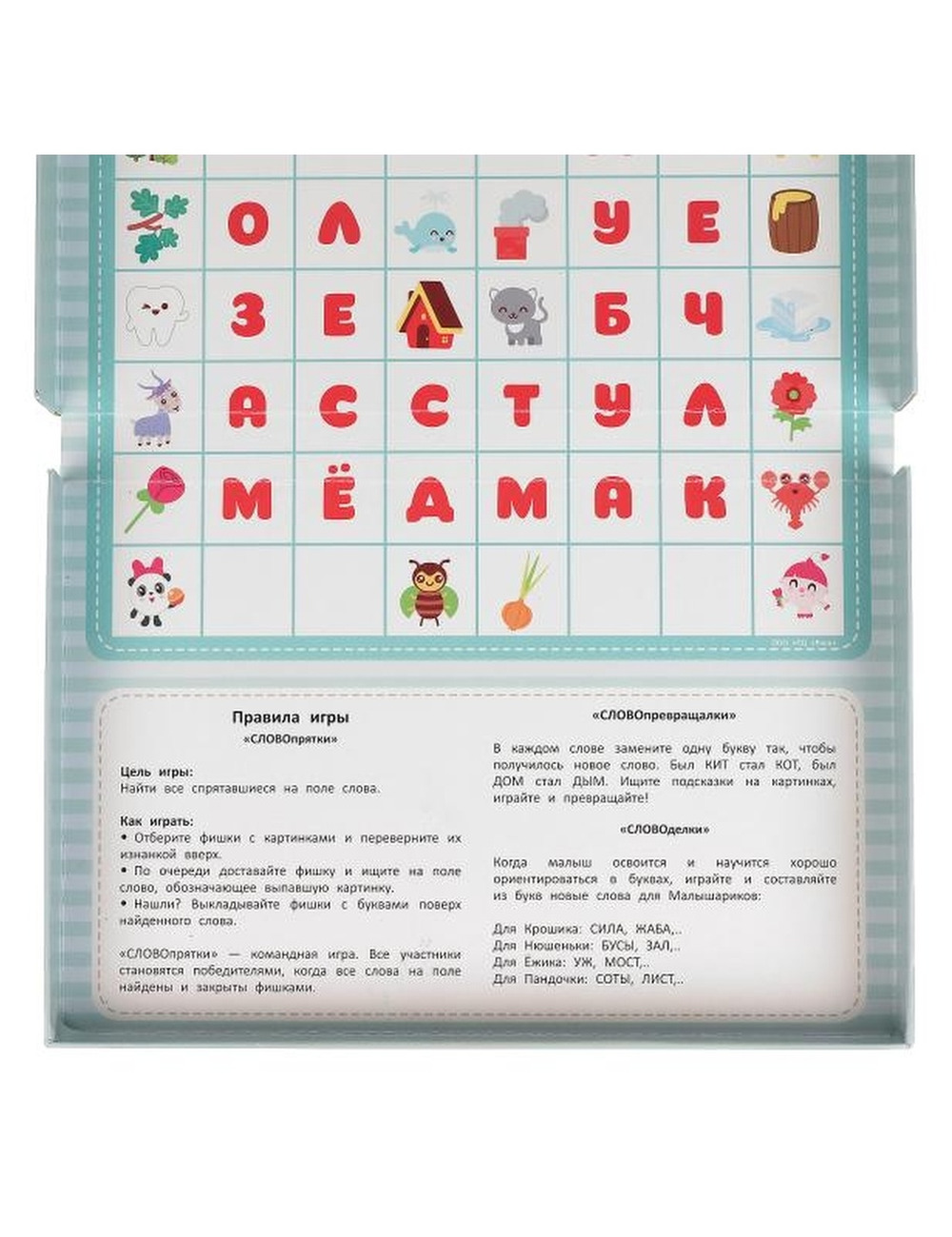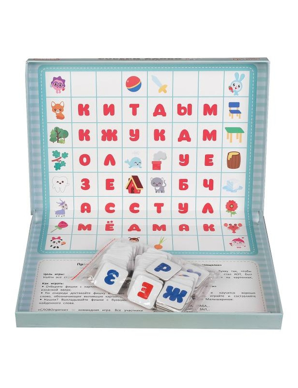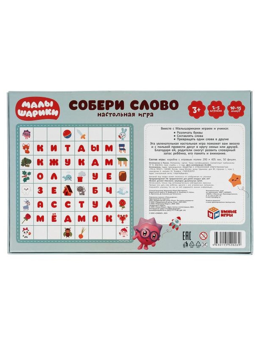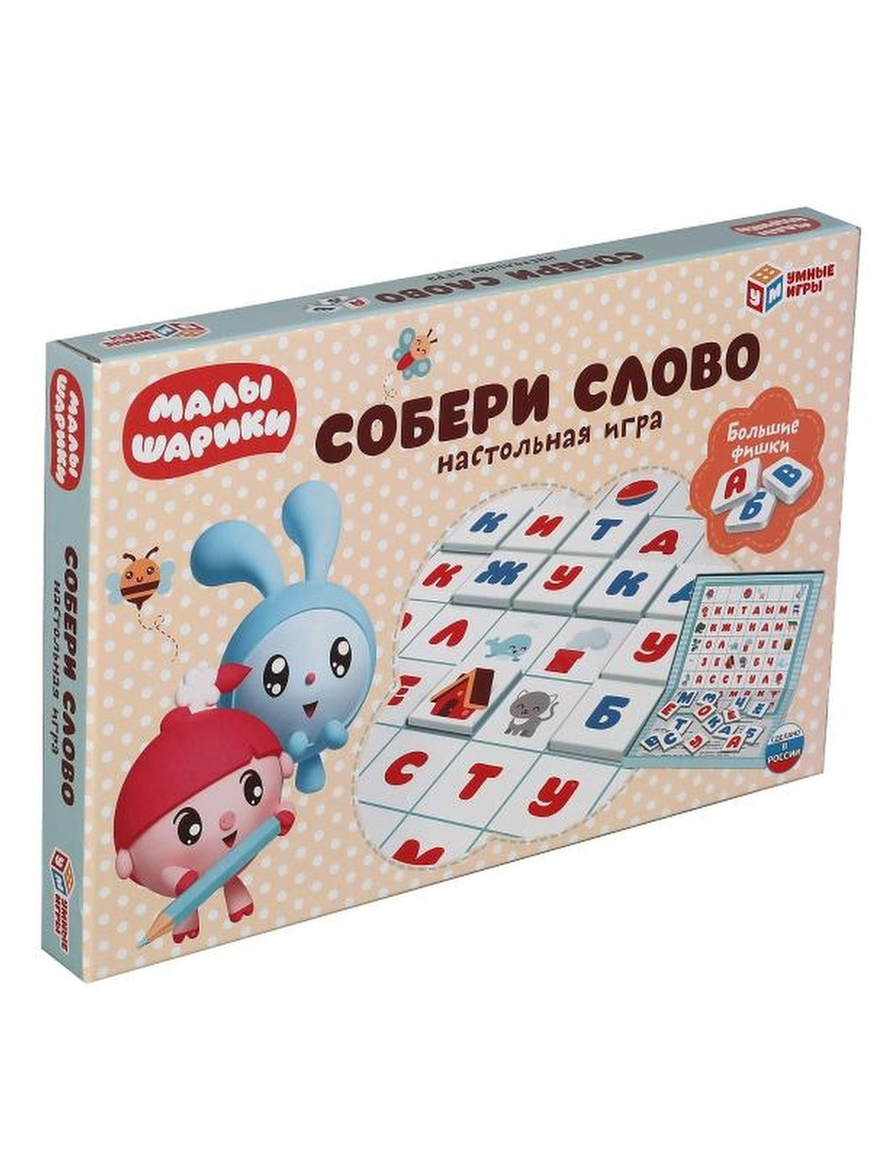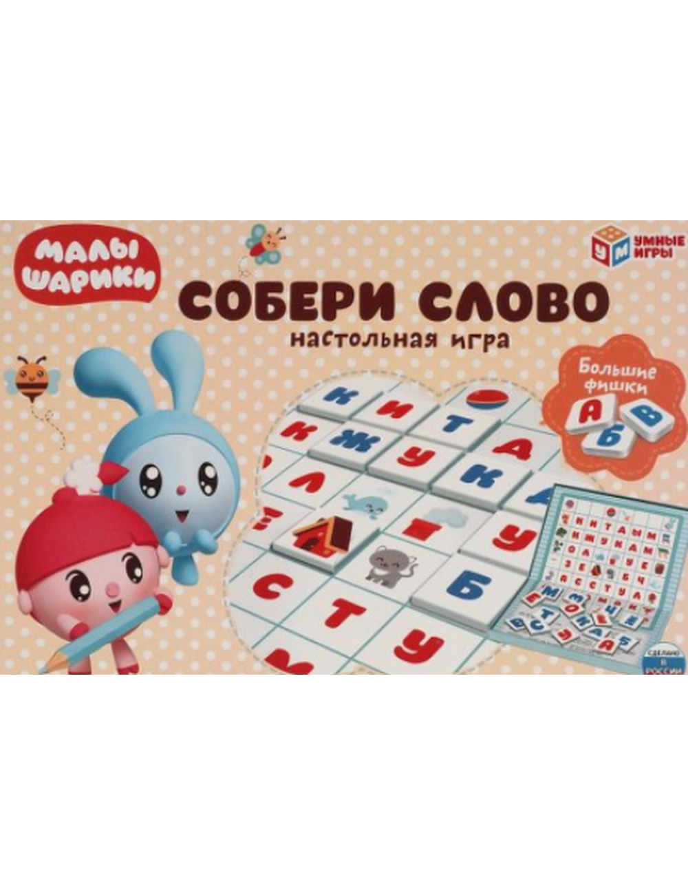 Настольная игра "Малышарики. Собери слово. Большие фишки" ТМ "Умные игры" - отличный вариант для проведения досуга в семейном кругу или в компании друзей. Комплектация и особенности: - коробка с игровым полем внутри - крупные игровые фишки с буквами - игра рассчитана на 2 - 5 игроков - дизайн с любимыми персонажами С этой весёлой настольной игрой ребёнку предстоит погрузиться в увлекательный процесс составления слов. Игра будет очень творческой, и вместе с тем потребует от игроков продемонстрировать логические навыки и стратегическое мышление. Именно поэтому она подходит для игроков любого возраста и быстро увлечёт и взрослых, и детей. Благодаря компактным размерам игру удобно брать с собой. Настольная игра ТМ "Умные игры" расширяет словарный запас и кругозор, а так же развивает: - логику - внимание - скорость мышления - память - внимание Размер упаковки: 3 х 30 х 20 см. Материал: картон. Рекомендовано детям старше 3-х лет.