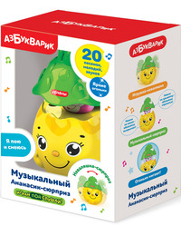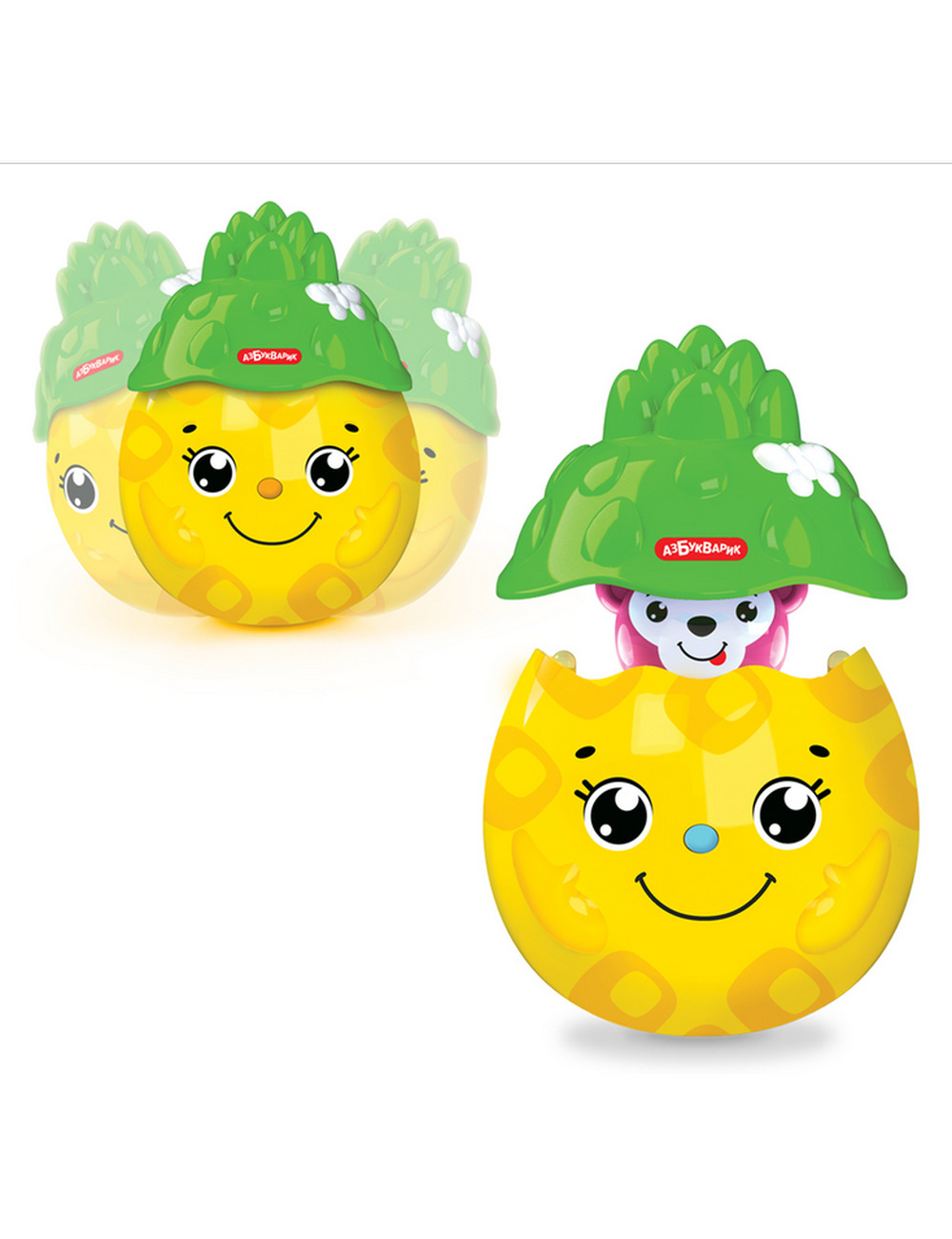 Игрушка-сюрприз порадует любого ребенка, особенно если этот сюрприз – музыкальный! Кто же прячется в большом ананасике? Нажми скорее на носик-кнопочку! Ух ты – это обезьянка! Продолжай нажимать на кнопочку – обезьянка споет 10 песенок и мелодий («Друзья», «Песенка про счёт», «Весёлые противоположности», «Пляшут весело детишки», «Бум Бум», «Весёлая карусель», «Песенка про кузнечика» и др.). Чтобы обезьянка обратно спряталась в домик-ананасик, нужно нажать на крышечку. А еще с ананасиком можно играть как с неваляшкой – раскачивать его в разные стороны!
