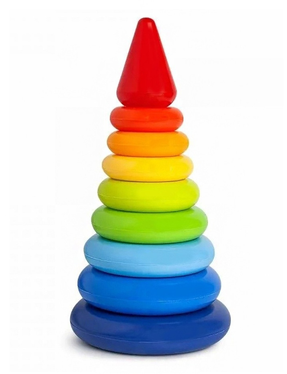 Уменьшенная копия большой пирамидки. Традиционный дизайн, качественное исполнение. Игрушка состоит из устойчивого прочного стержня, макушки-конуса и семи колец разного размера. Цвет каждого колечка соответствует одному из цветов радуги, что делает пирамидку по-настоящему полезной для изучения цвета.