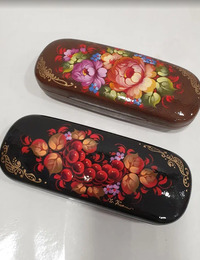 Очечник представляет из себя твердую шкатулку из добротного пластика, обтянутого экокожей, вручную расписанную масляными красками, покрыта несколькими слоями лака. Внутри бархатная футляр отделан бархатом.