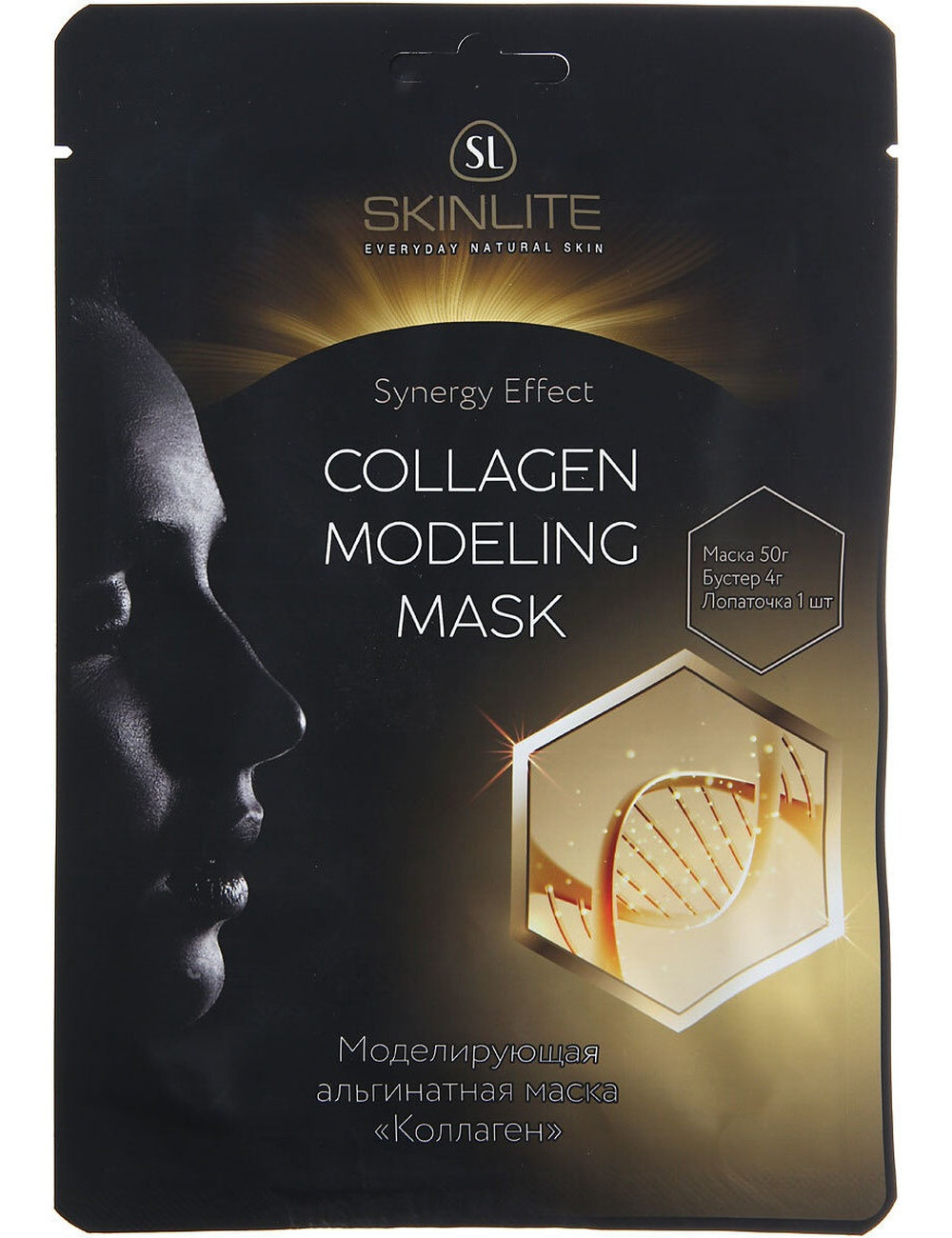 Маска обладает увлажняющим эффектом, восстанавливает водный баланс, оказывает лифтинговый эффект, моделирует овала лица, разглаживает морщины, уменьшает поры, повышает тонус и эластичность кожи. Снимает следы усталости, улучшает цвет лица, обладает детоксицирующим действием, насыщает кожу микроэлементами. Альгинатная маска SKINLITE - это удобный набор для быстрого приготовления профессиональной маски в домашних условиях. В набор для процедуры входят: уже готовый гель оптимальной консистенции с точно рассчитанной концентрацией активных компонентов, в котором используется специальная очищенная вода; бустер-усилитель действия самой маски, который смешивается с гелем непосредственно перед процедурой, в результате чего активизируются действующие компоненты и достигается максимальный эффект; лопаточка для замешивания маски.