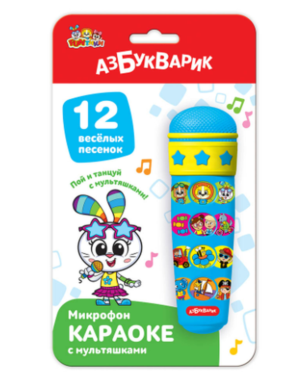 Игрушечный микрофон сыграет 12 детских хитов: «Фантики», «Песенка щенка Тимы», «Песенка Зайки», «У друзей нет выходных», «Барбарики. Что такое доброта?», «Догони», «Пчёлка и фея», «Красный трактор», «Фантазёры», «Кораблик», «Где-то в жаркой Африке», «Я – пират». На каждой кнопочке – 3 песенки.