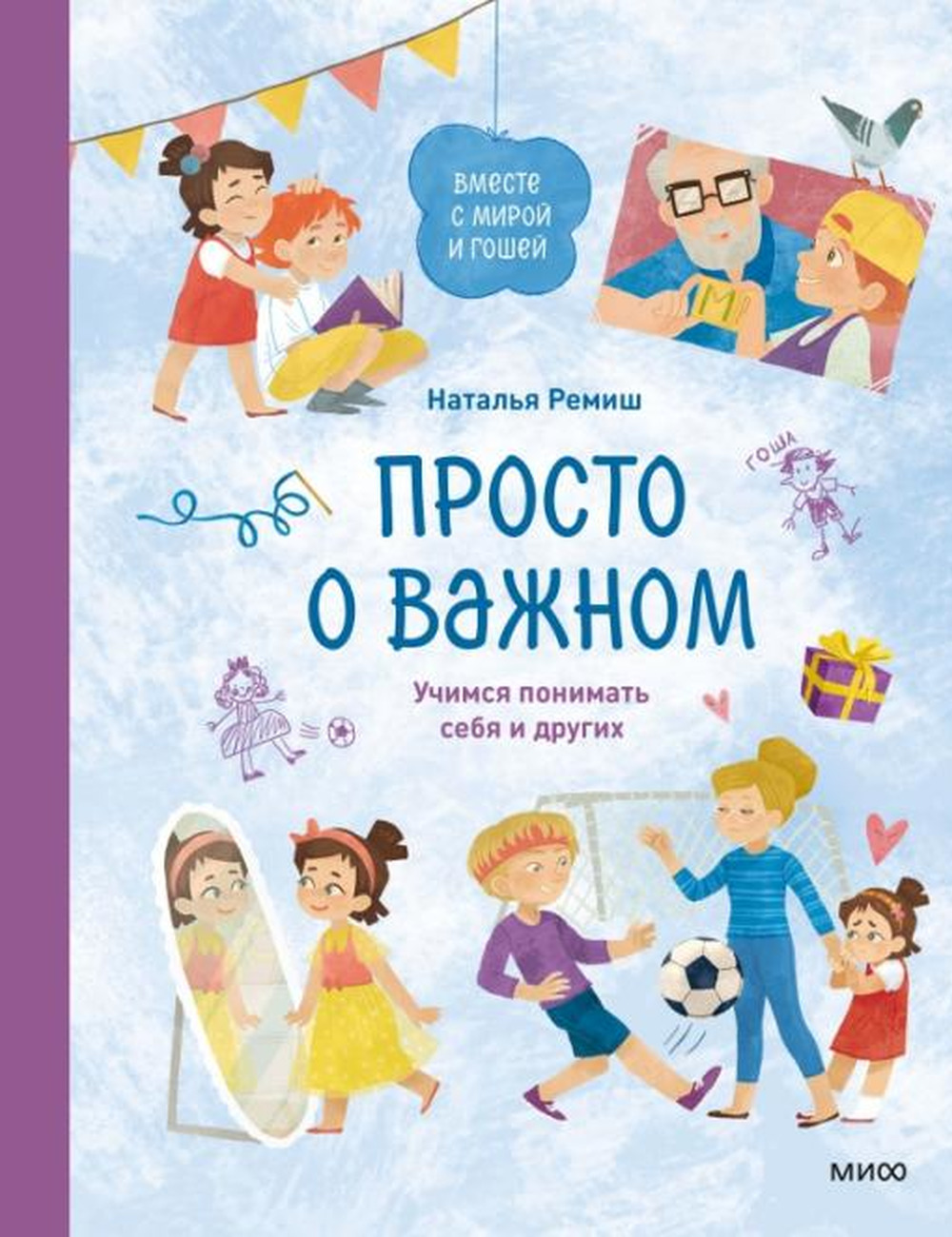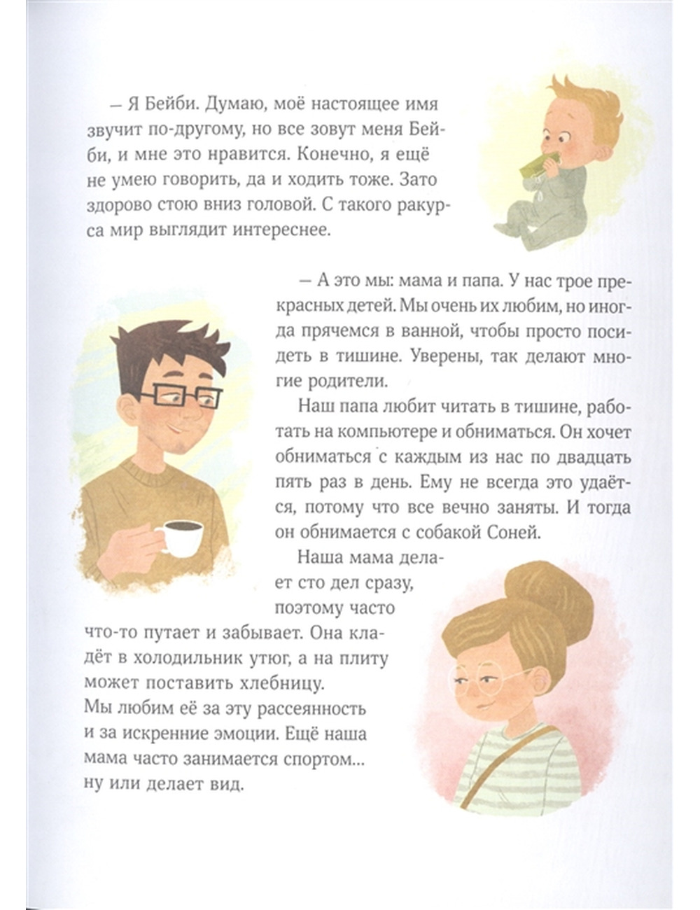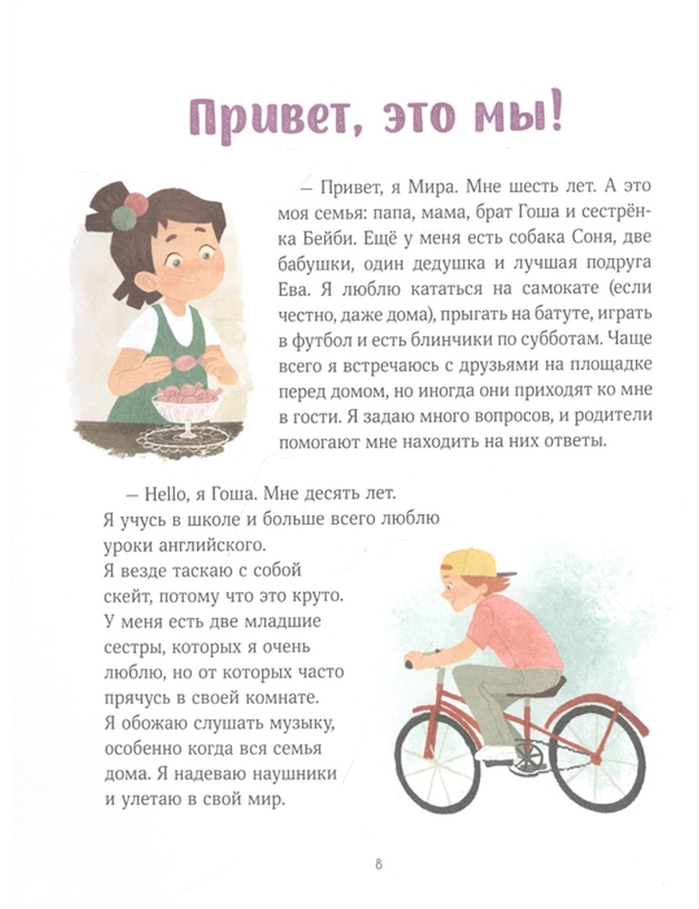 10 историй из жизни двух детей — Миры и Гоши — сопровождаются комментариями психологов и списком вопросов. Эти вопросы помогут обсудить проблемы обмана, воровства, дружбы, гендерных игр — тем, с которыми сталкивается каждая семья.