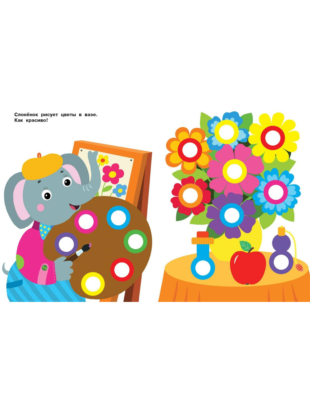 Приклеивая на картинки в этой книге яркие разноцветные многоразовые наклейки-кружочки, ваш малыш сможет повторять названия цветов и предметов, развивать мелкую моторику и усидчивость.
