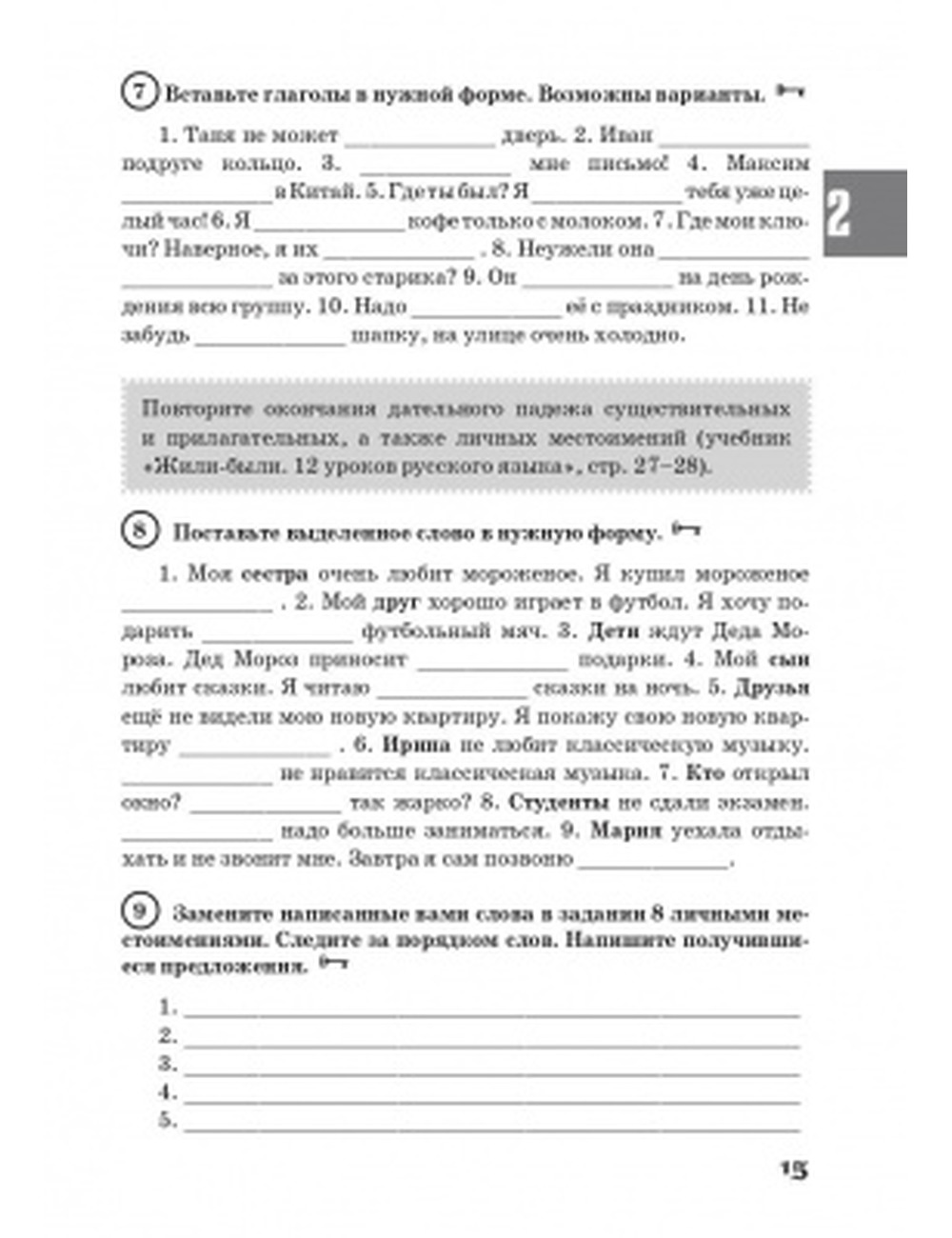 Пособие входит в учебный комплекс по русскому языку как иностранному "Жили-были. 12 уроков русского языка". Его цель - закрепить грамматические навыки посредством системы дополнительных тренировочных упражнений. Лексическое наполнение активизируемых грамматических моделей соответствует особенностям живой русской речи, что способствует и развитию навыков говорения. Примеры, простые в отношении лексики, но характерные для современного разговорного языка, выполняют функцию образцов, на основе которых обучаемые могут строить свою речь.