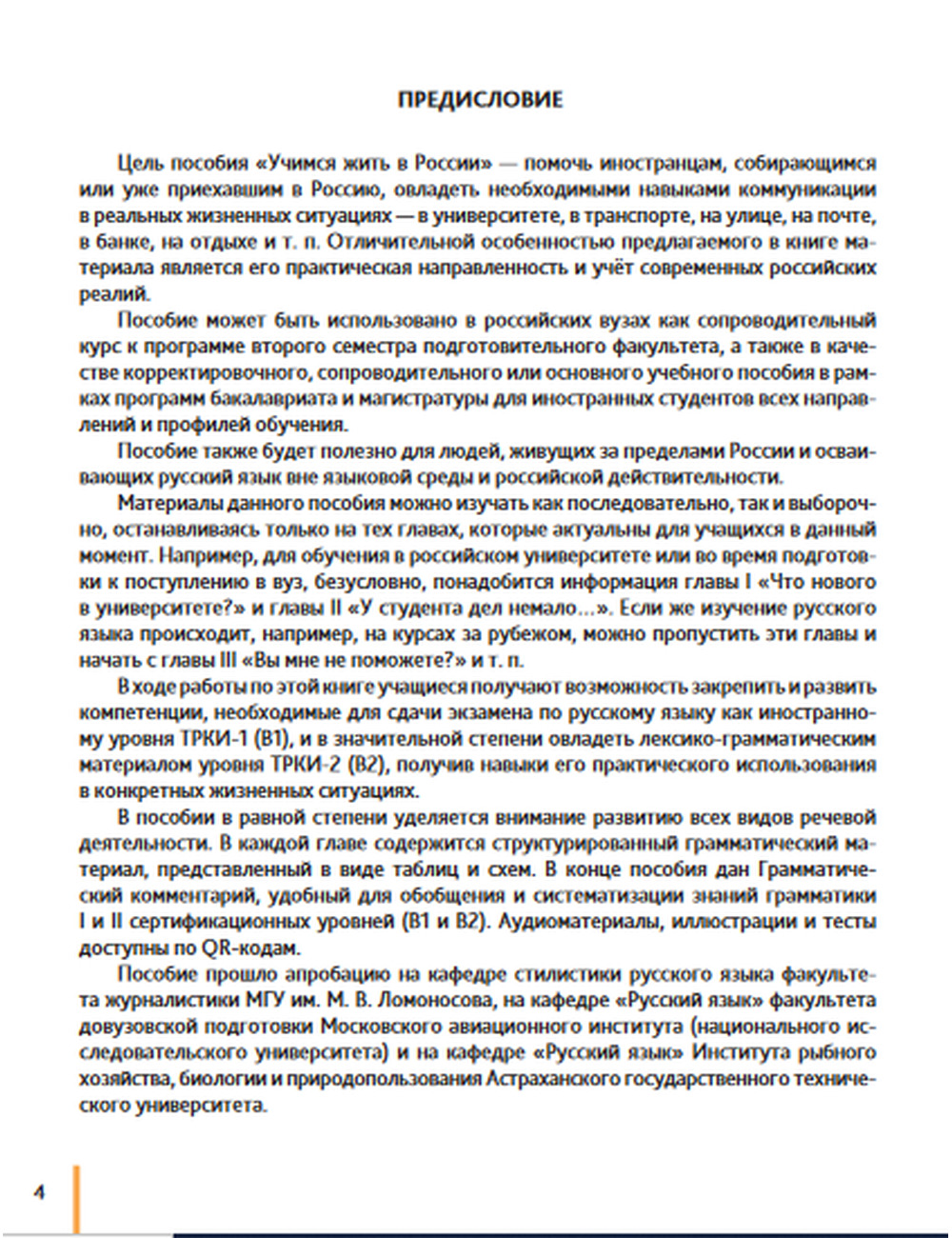 В ходе работы с пособием учащиеся получают возможность закрепить и развить компетенции, необходимые для сдачи экзамена по русскому языку как иностранному уровня ТРКИ-1 (В1), и в значительной степени овладеть лексико-грамматическим материалом уровня В2, получив навыки его практического использования в конкретных жизненных ситуациях.