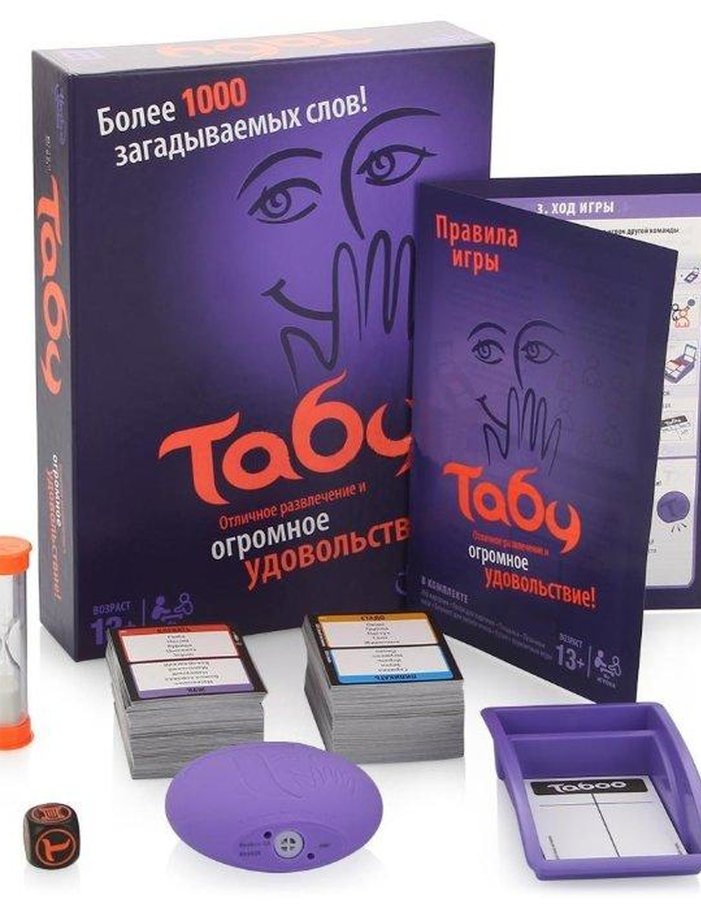 Веселая игра для всей семьи "Табу" подарит незабываемые эмоции и научит подбирать правильные слова. Разделитесь на команды, запустите таймер и угадывайте вместе загаданные слова. Самое главное - не использовать слова-табу. Если один из игроков называет запретное слово, ход переходит следующей команде. В Taboo побеждает та команда, которая угадает наибольшее количество слов. Hasbro Gaming и все связанные термины являются торговыми марками компании Hasbro. В набор входит: 260 карт, пищалка для слов-табу, блокнот для записей, песочные часы, кубик, площадка для ставок и правила. Подробнее: Для детей в возрасте от 13-ти лет и старше; Для 4 и более игроков.