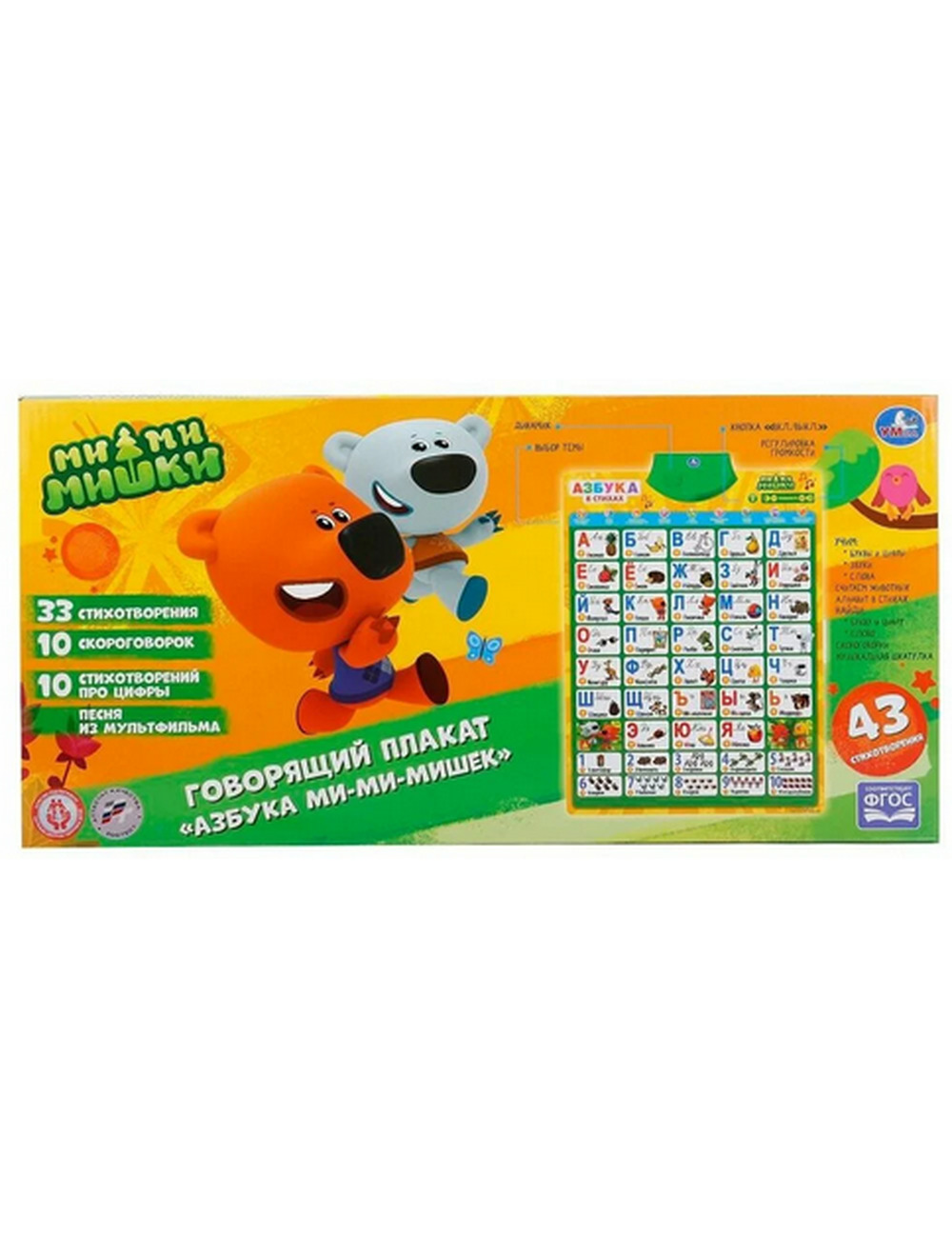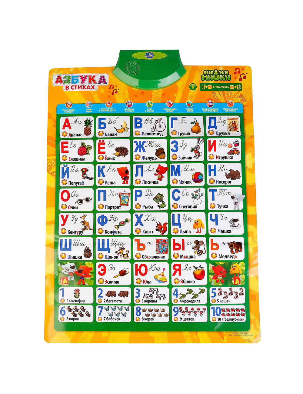 Особенности:- Данный обучающий плакат рассчитан на детей старше трех лет.- Он имеет прямоугольную форму и динамик, расположенный в верхней части. Кроме того, здесь также находятся копки управления, которые отвечают за включение и регулировку громкости.- Данный плакат познакомит ребенка с азбукой, простым счетом, а также сделает его досуг более веселым и интересным, благодаря многочисленным развлекательным функциям.- Всего плакат включает в себя: 33 стихотворения, 10 скороговорок, 10 стихотворений про цифры и песню из мультфильма.- В процессе изучения азбуки ребенок сначала познакомится с буквами, в чем ему помогут красочные картинки, изображающие разнообразных животных, предметы и еду, названия которых начинаются с них. А затем ему предлагается прочитать эти названия, представленные в виде подписей к предложенным изображениям. Гласные и согласные выделены на плакате разыми цветами, чтобы не путать малыша.- Также ребенок сможет познакомится с цифрами от 1 до 10, рядом с каждой из них располагаются рисунки с количеством предметов, соответствующих им.- Игрушка изготовлена из качественных материалов, соответствующих современным стандартам качества.- В процессе игры ребенок сможет развить мелкую моторику рук, улучшить свое слуховое восприятие, память, выучить алфавит, цифры, а также хорошенько повеселиться.Характеристики:Возраст: от 3 лет.Комплектация: обучающий плакат.Питание: на батарейках.Размер: 3 x 44 x 22 смВес: 296 г.Материал: пластик, металл.Бренд: Умка.Страна обладатель бренда: Россия.