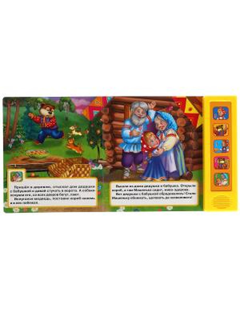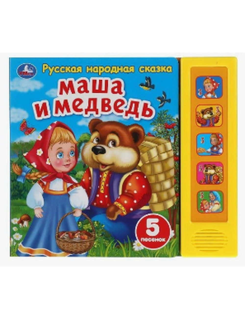 Музыкальная книга Маша и медведь ТМ УМка станет отличным подарком для вашего малыша: - известная сказка - 5 звуковых кнопок - 5 песен по мотивам сказки - красочные иллюстрации - кнопка Вкл./Выкл. на обороте Ребёнок с удовольствием будет листать плотные страницы, рассматривать яркие картинки, вместе с родителями читать интересную сказку и, конечно, нажимать на кнопки и слушать весёлые песенки. Малыш легко освоит включение звука: по нажатию на кнопку песенка включится, при втором нажатии выключится. Благодаря компактному размеру книгу удобно взять с собой в дорогу. Музыкальная книга ТМ УМка расширяет кругозор и развивает: - слуховое восприятие и музыкальный слух - навык чтения - фантазию - образное мышление - память - тактильное восприятие Объём: 10 стр. Формат: 200 х 175 мм. Материал: пластмасса + картон. Работает от 3-х батареек типа LR44 (в комплекте). Рекомендовано детям старшего дошкольного возраста.