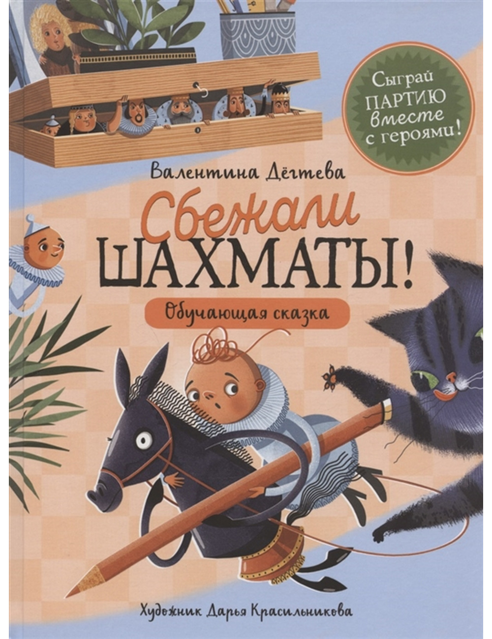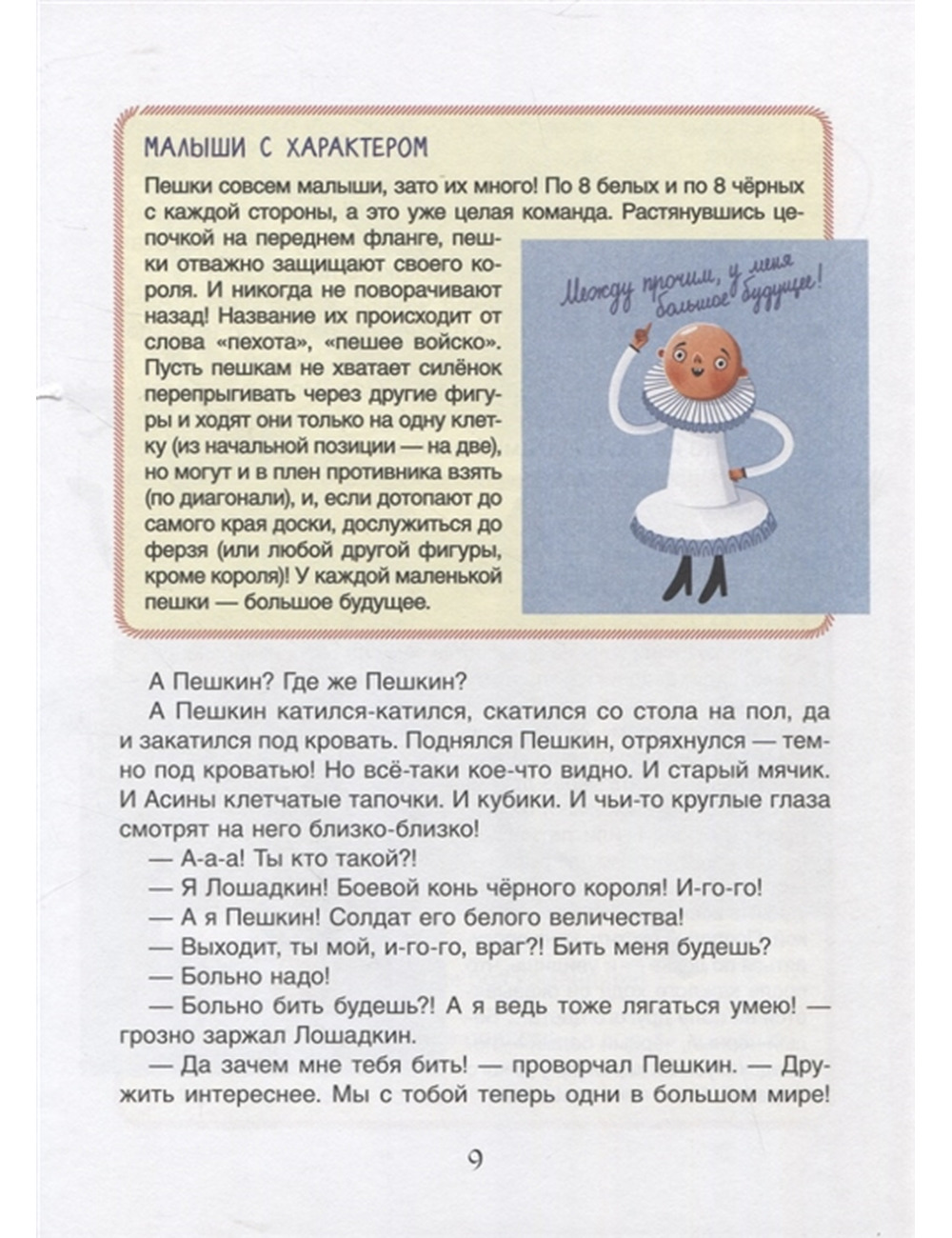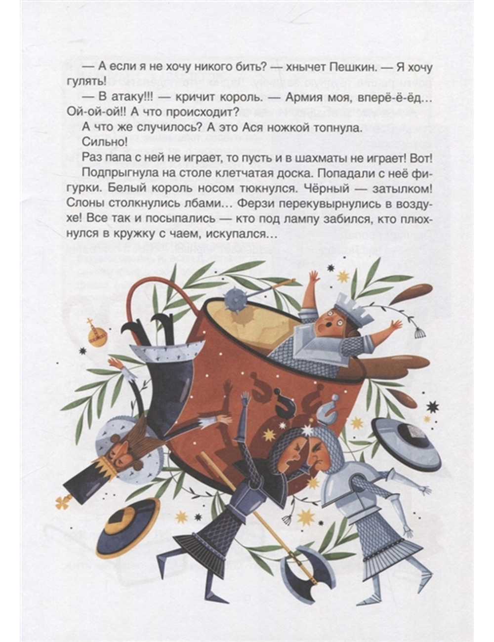 Папа вечно сидит за своими шахматами, а на Асю ноль внимания. Как-то раз не выдержала Ася да как топнет ножкой! Вмиг посыпались фигурки с шахматной доски: кто под лампу закатился, кто плюхнулся в кружку с чаем Стыдно стало Асе, собрала она все фигурки, вот только две так и не нашла белого Пешкина и черного Лошадкина. Теперь двух потеряшек ждут удивительные приключения: бегство от кошки, плавание верхом на резиновой уточке и даже сражение с грозным королем Кактусом В этой книжке вы найдете не только забавную сказку о похождениях двух фигурок, но и множество занимательных фактов о шахматах, а также словарик с важными терминами. А прочитав книжку до конца, вы сможете самостоятельно разыграть описанную в ней шахматную партию!