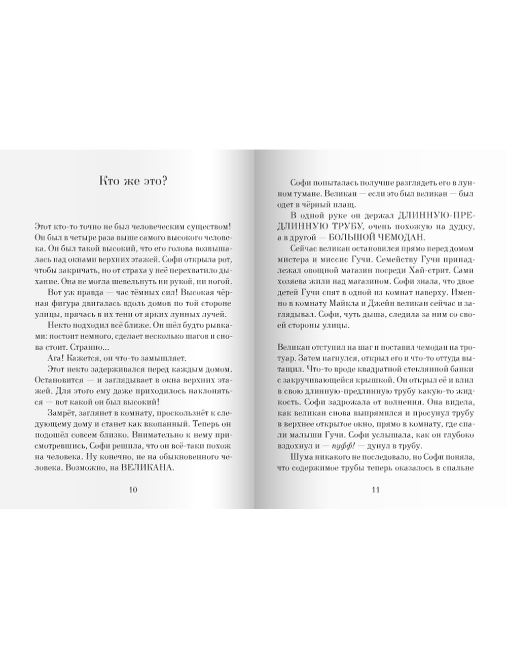 БДВ — не какой-нибудь ужасный великан-людоед. Нет, он хороший Большой и Добрый Великан. Софи повезло, что в час тёмных сил её похитил БДВ, а не Кровушкипопьём, не Мясазаглотнём или не кто-то другой из великанов, — иначе её бы уже съели на завтрак. Узнав о том, что великаны на всех парах мчатся в Англию, чтобы закусить маленькими англичанами, Софи понимает: нельзя сидеть сложа руки! Надо остановить негодяев, покончить с убийствами раз и навсегда! И без БДВ ей с этой задачей не справиться.