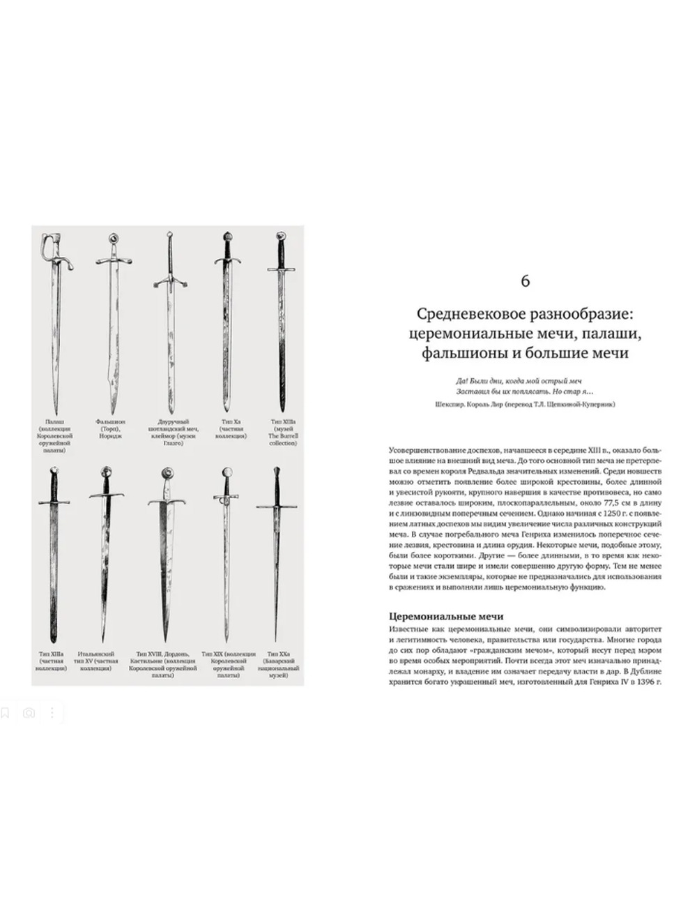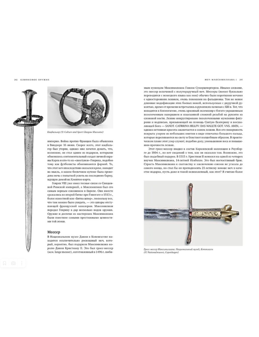 История эволюции клинкового оружия, которое использовали фехтовальщики, — это история огромного семейства его разновидностей, включая хопеши, ксифосы, махайры, кописы, фалькаты, гладиусы, спаты, палаши, фальшионы, полутораручные и двуручные мечи, мессеры, дюссаки, боккэны, рапиры, эстоки, кинжалы, шпаги, а также детали доспехов. В определенном смысле мечи (собирательное понятие) — это произведения искусства, и в книге представлены их лучшие образцы. Авторитетный западный эксперт Майк Лоадс помещает рассказ об этих образцах в широкий исторический контекст, выделяя основные вехи истории войн и дуэлей. Во всей своей грозной красе перед нами предстают египетские, греческие, кельтские и римские мечи, мечи народов севера и крестоносцев, дуэльное оружие, мечи фараона Тутанхамона, короля восточных англов Редвальда, короля Англии Генриха V, императора Священной Римской империи Максимилиана I, самурая Уэсуги Кэнсина, короля Франции Генриха IV, лорда-протектора Англии Оливера Кромвеля, первого президента США Джорджа Вашингтона и, наконец, оружие времен битвы при Ватерлоо и Гражданской войны в США. Неотъемлемая черта повествования — сведения о процессе изготовления мечей и техническом прогрессе, об эволюции искусства фехтования, об изменении стилей и техник, о сферах использования мечей (боевые, траурные, церемониальные, мечи для казни и другие), о символическом значении меча. Издание снабжено множеством роскошных цветных и черно-белых иллюстраций, многие из которых публикуются впервые, глоссарием и указателем и несомненно заинтересует всех, кто увлечен историей оружия и фехтования.