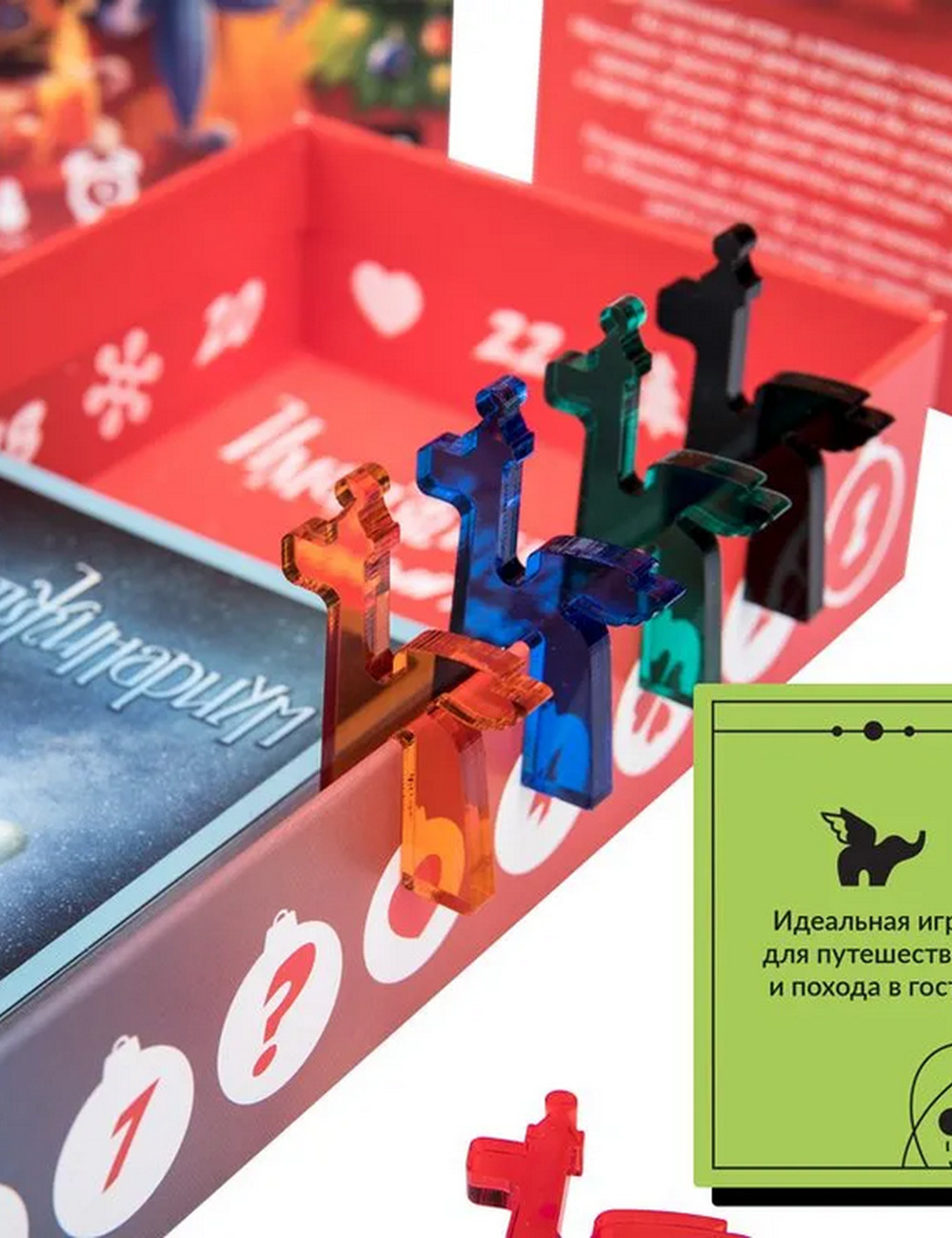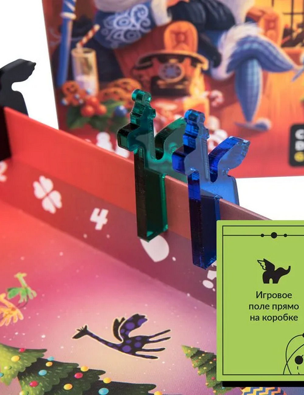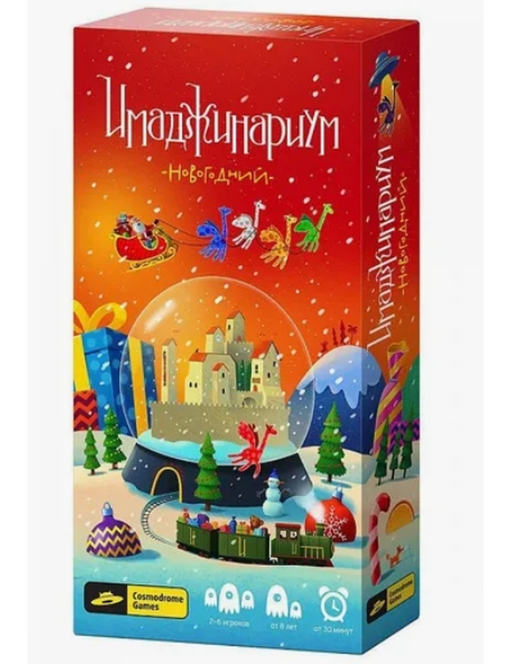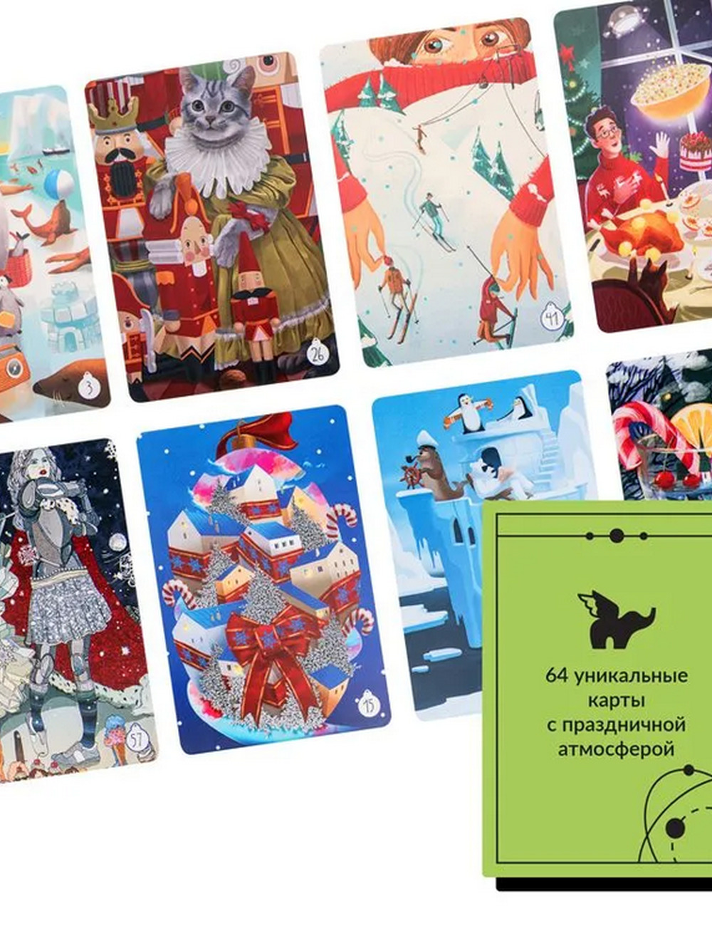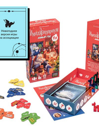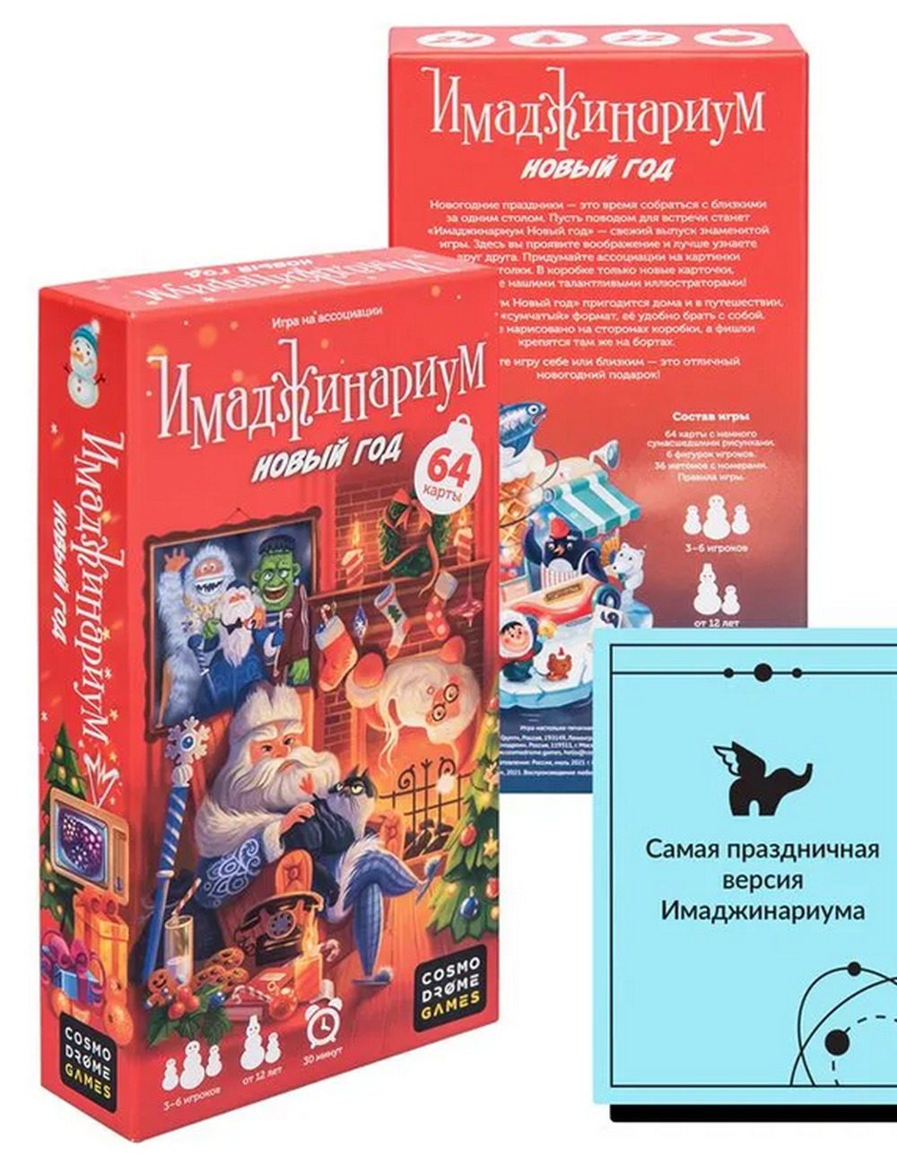 "Имаджинариум Новый год" - новая праздничная версия "Имаджинариума", которую так и хочется взять с собой в гости или в путешествие. Эта маленькая версия игры легко поместится даже в маленькую сумочку и с радостью отправится с вами в гости или путешествие.В настолке собрались 64 новогодние карточки с тысячами праздничных ассоциаций. Игрок, который загадывает их лучше всех, получит больше очков и первым приведет летающего оленя к финишу.Как играть? Вооружитесь картами и выберите того, кто первым станет ведущим. Он предложит ассоциацию, и каждый найдет у себя на картинках что-то подходящее. Карты перемешиваются, а игроки угадывают иллюстрацию ведущего и подсчитывают очки.Для кого? Для тех, кому не сидится на месте. А ещё для семей, друзей, коллег и даже незнакомцев. Настолка подойдет игрокам старше 12 лет. Игровое поле расположилось на бортах коробки, где так удобно расположились крылатые олени. Карточек всего 64, но их вполне хватит на получасовую партию.