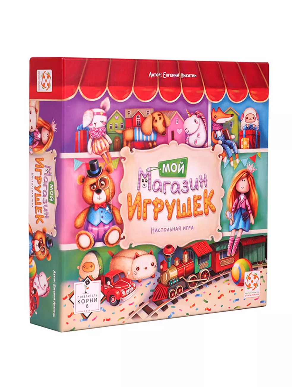 Представьте, что Вы стали владельцем магазина игрушек! Ваша задача - с умом расставить игрушки-тайлы в магазине. Чем больше игрушек одного типа будут находиться рядом, тем больше монет вы за них получите. Кроме того, вы можете получить особые награды за самую разнообразную коллекцию игрушек одного типа, а также бонусы за одинаковые игрушки. В состав настольной игры "Мой магазин игрушек" входят: 64 карточки с игрушками; 4 стартовые карточки с кассой; 60 жетонов денег номиналом 10 монет; 16 жетонов наград: 4 награды за разнообразие игрушек; 4 награды за большинство одинаковых игрушек; 8 запасных наград; 7 фишек игроков; 7 пластиковых подставок для фишек; 1 счётчик монет; правила игры;