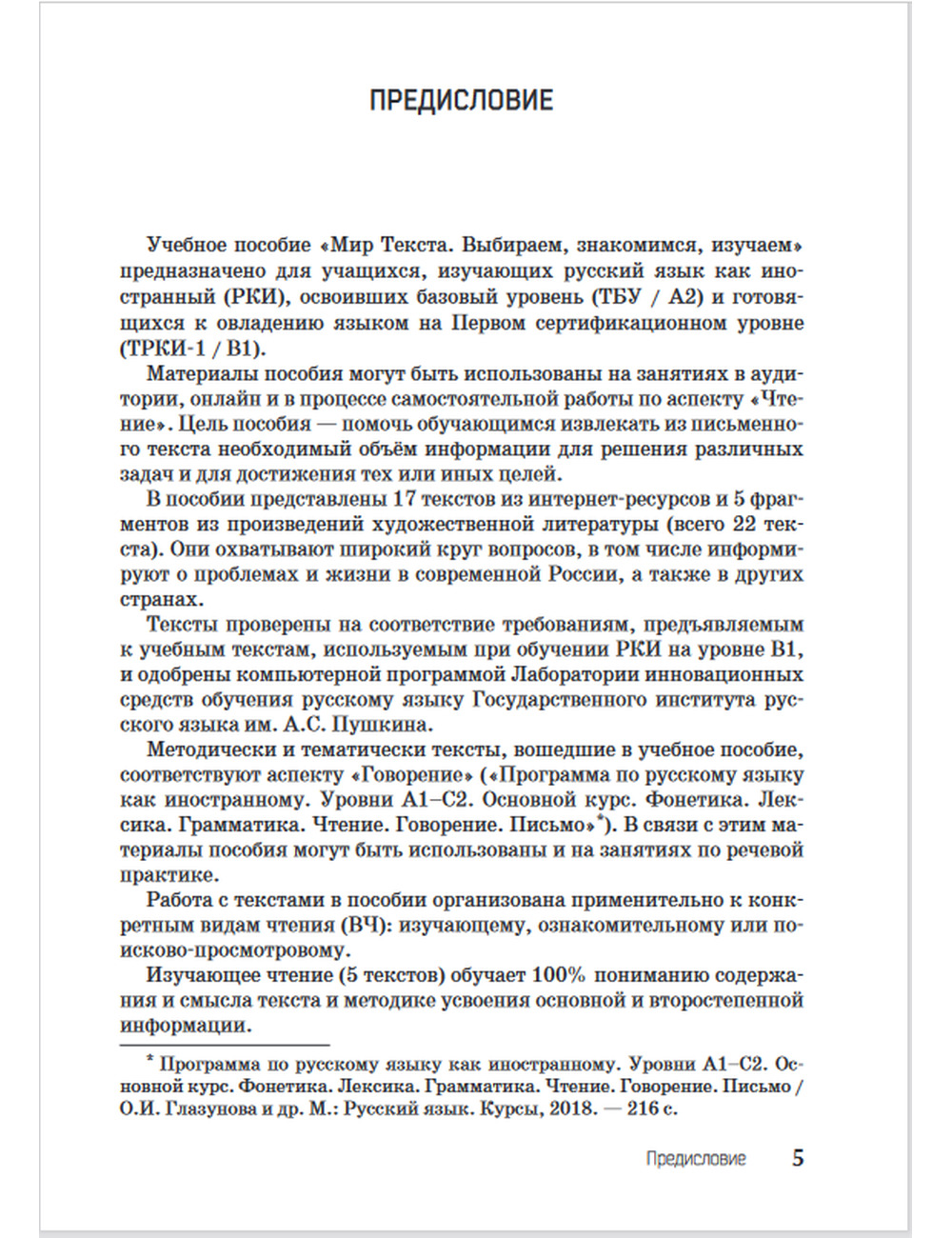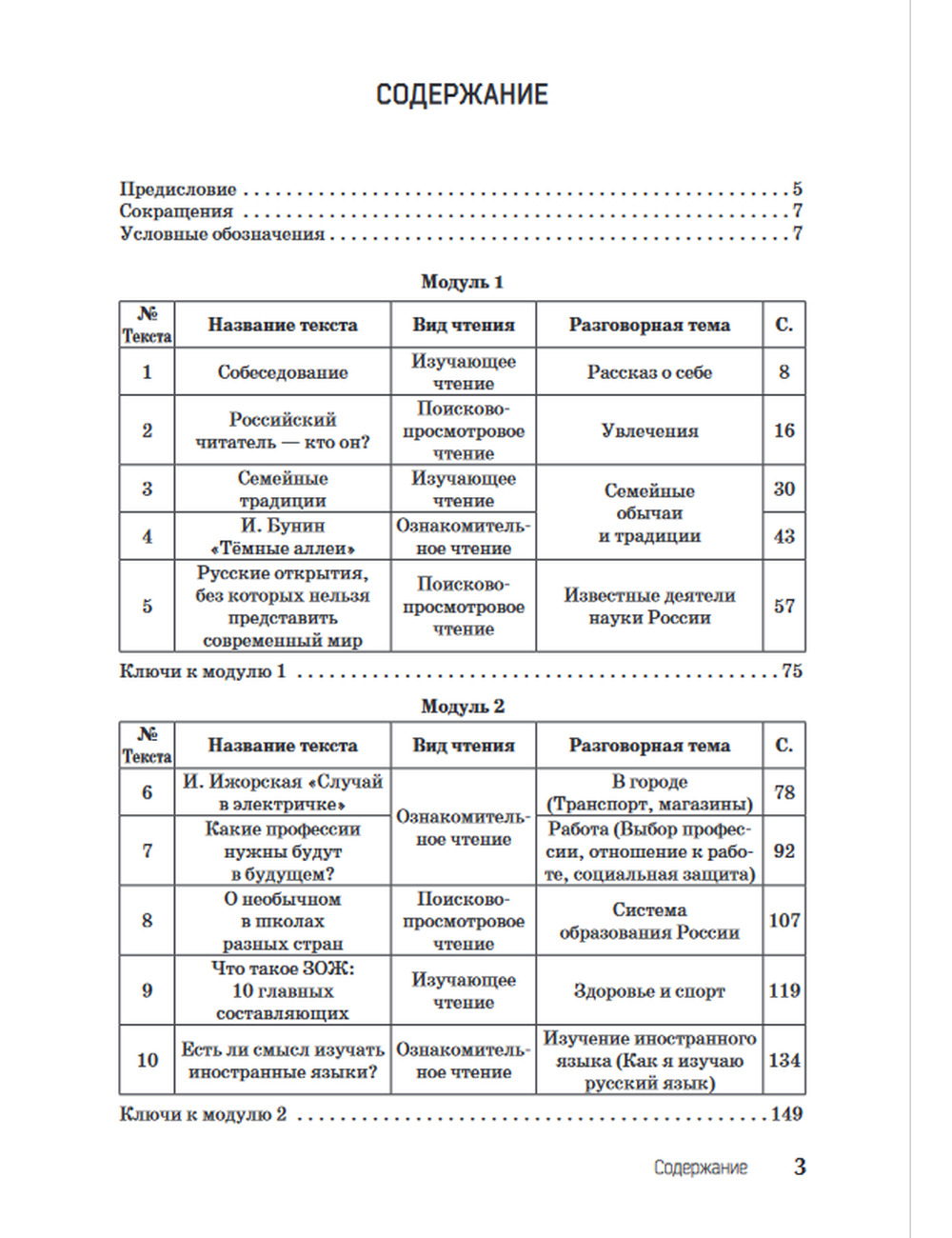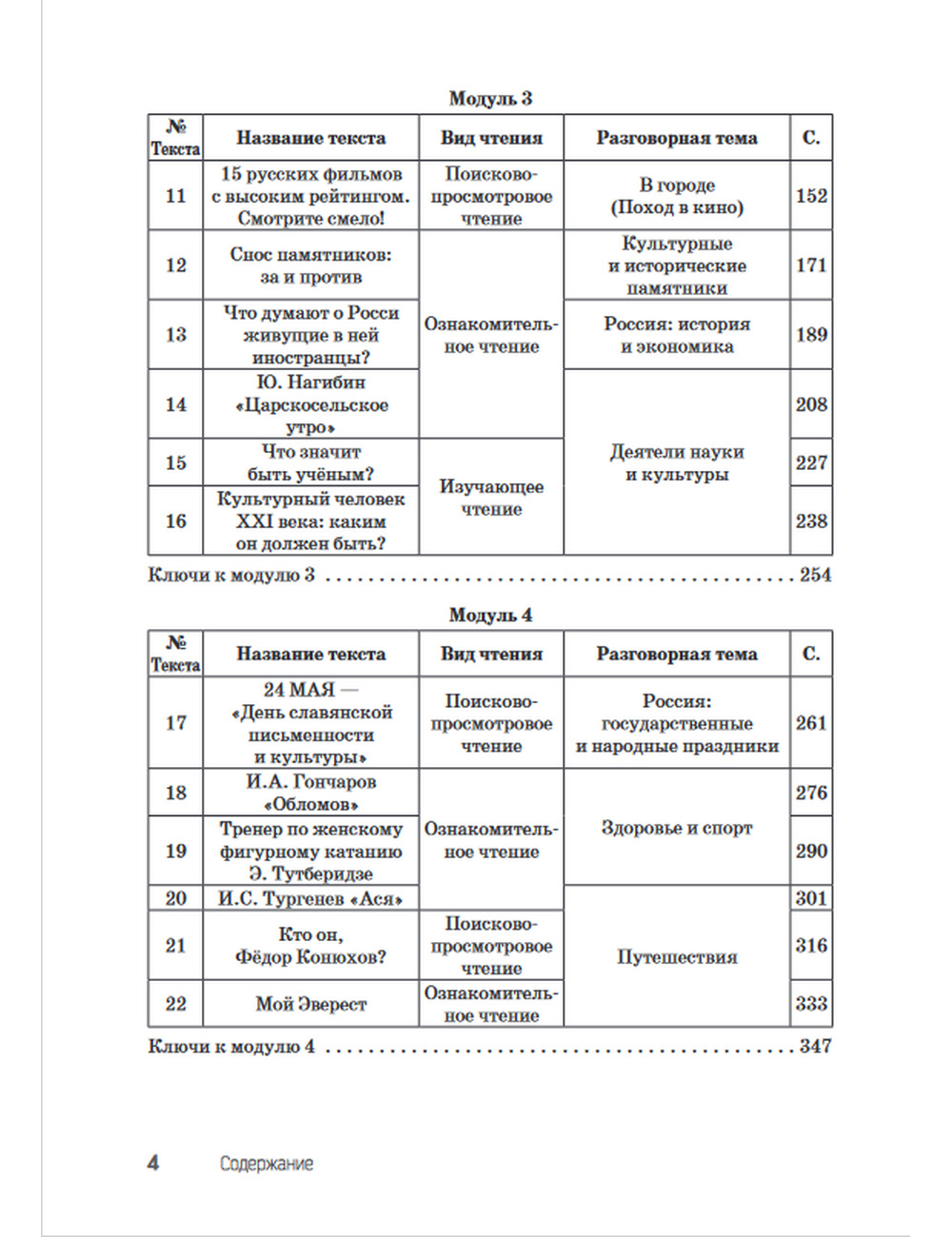 Пособие содержит материалы, подготавливающие учащихся к различным видам чтения (изучающему, ознакомительному и поисковопросмотровому). Пособие состоит из четырёх модулей, в каждый из которых включены как тексты художественной литературы, так и тексты, рассказывающие о жизни современной России и других стран. Каждый текст сопровождается предтекстовыми, послетекстовыми и домашними заданиями, словарём, комментариями и иллюстрациями.