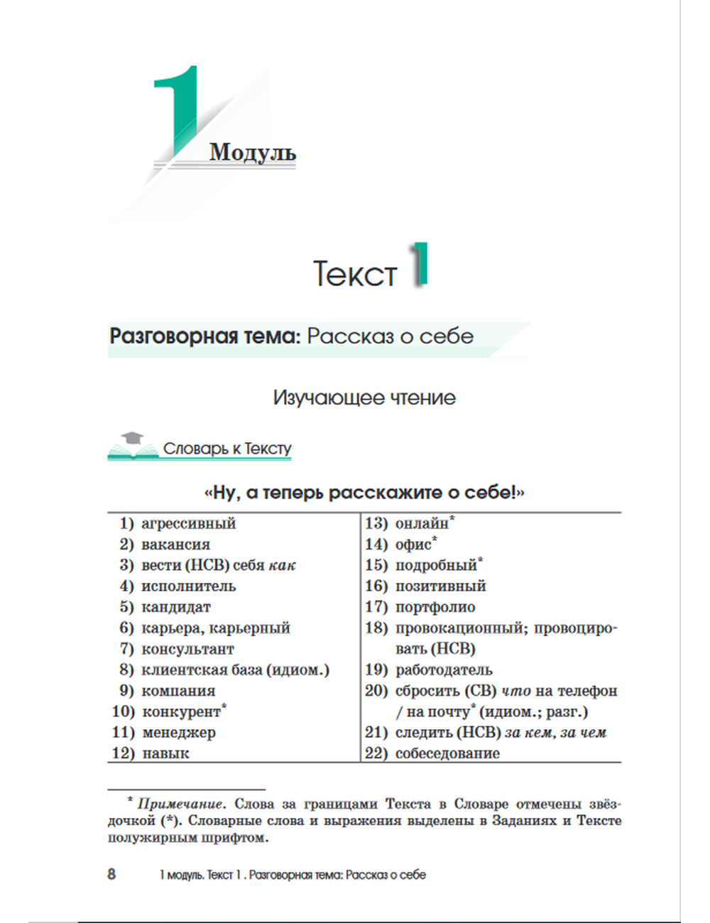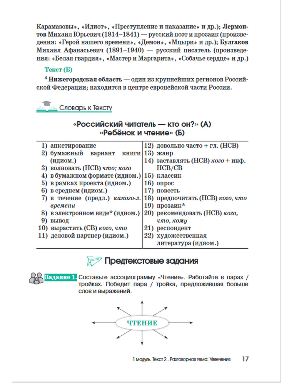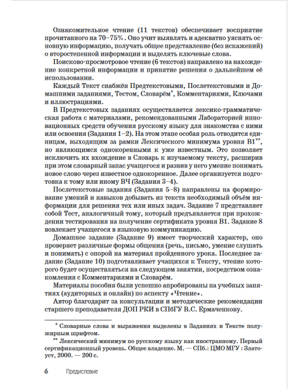 Пособие содержит материалы, подготавливающие учащихся к различным видам чтения (изучающему, ознакомительному и поисковопросмотровому). Пособие состоит из четырёх модулей, в каждый из которых включены как тексты художественной литературы, так и тексты, рассказывающие о жизни современной России и других стран. Каждый текст сопровождается предтекстовыми, послетекстовыми и домашними заданиями, словарём, комментариями и иллюстрациями.