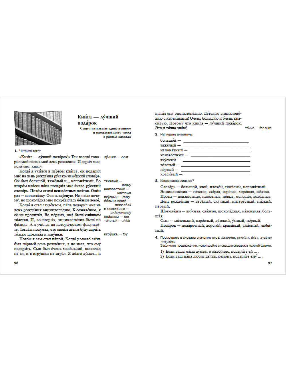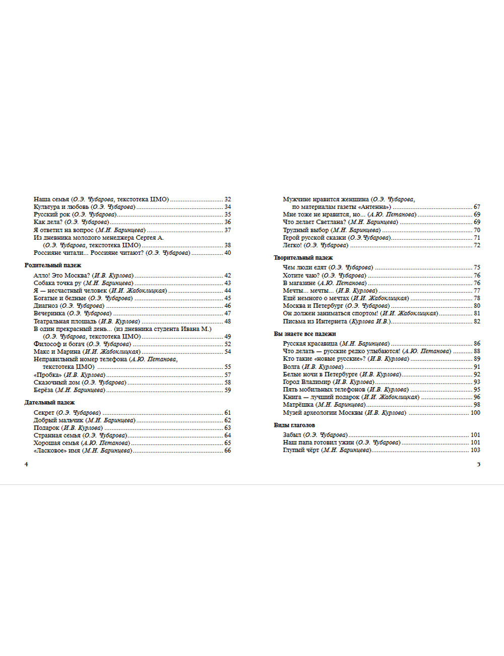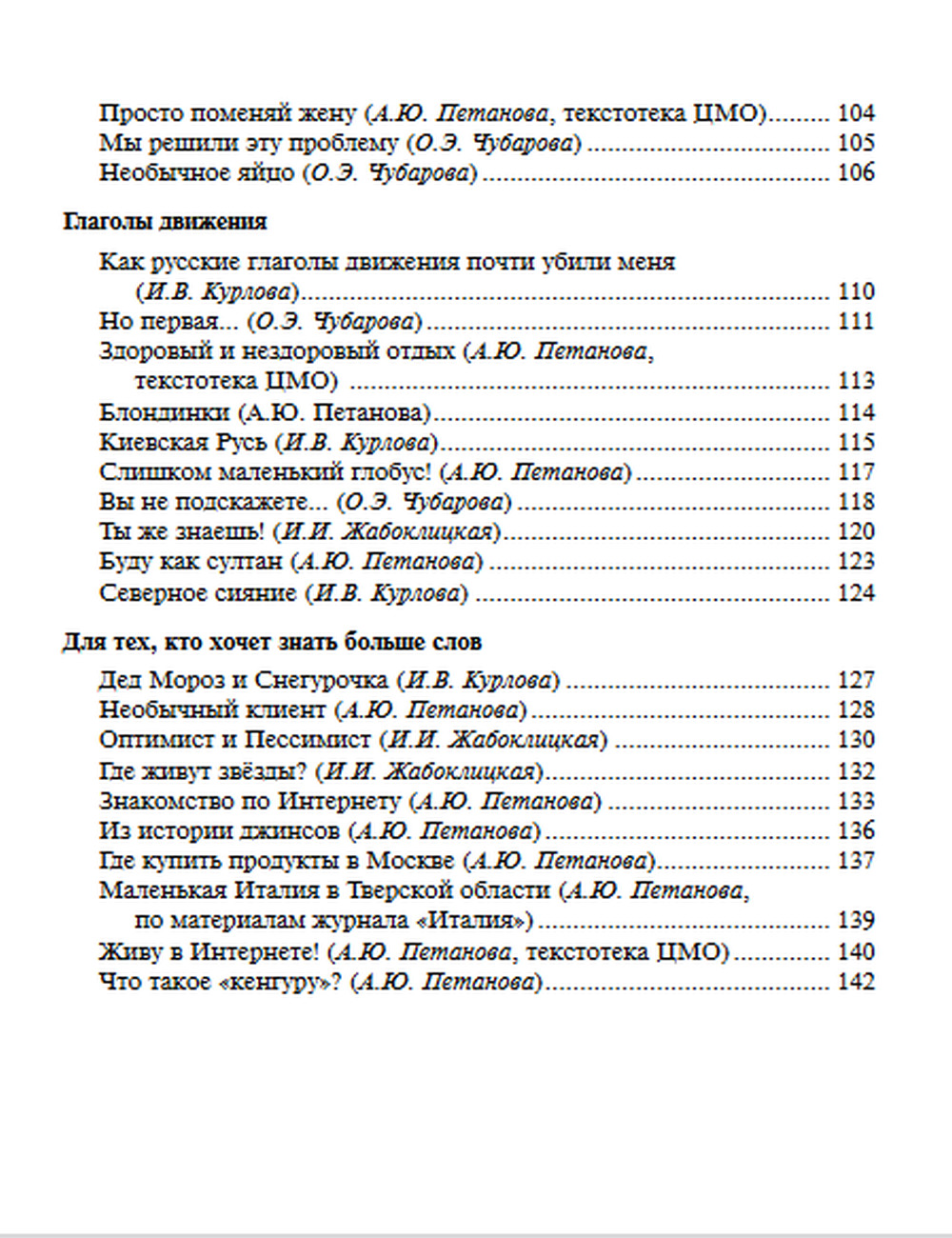 В пособии собрано около ста небольших по объему текстов с упражнениями. Тексты аутентичны, занимательны и просты. К чтению книги можно приступать уже с первых дней изучения русского языка. Читатель найдет здесь сведения о культуре и традициях России, веселые истории из жизни россиян и иностранцев, анекдоты, полезную информацию. Разнообразные в тематическом и жанровом отношении короткие рассказы, которые по выбору преподавателя могут использоваться для закрепления той или иной грамматической формы и для развития речи, предопределили название сборника.