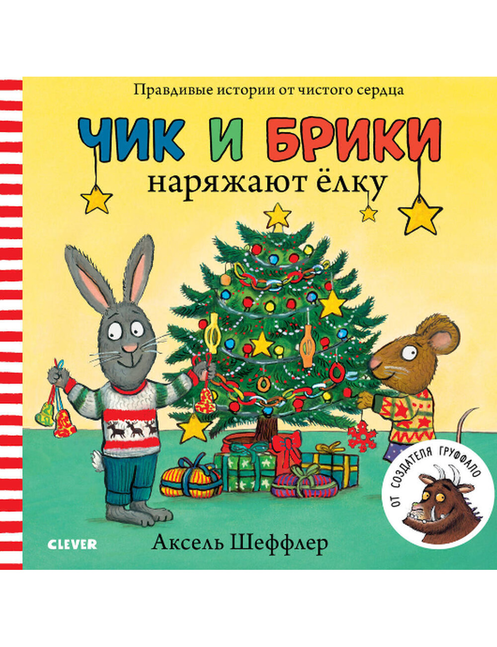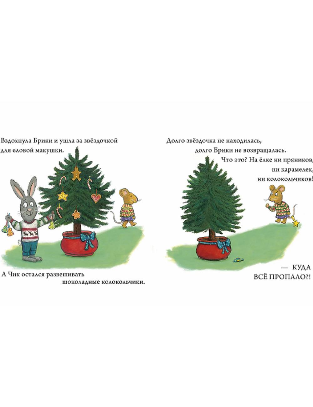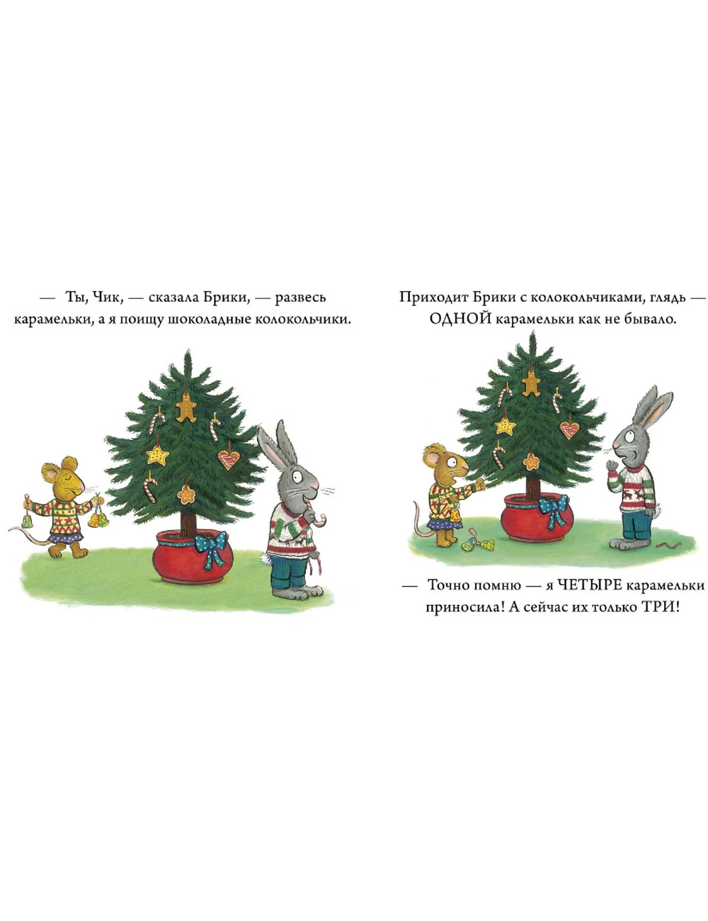 Чик и Брики развешивали на ёлочке всякие вкусности. Но пряники, карамельки и шоколадные колокольчики вдруг начали исчезать. А потом у Чика разболелся животик. Зайчика Чика и мышку Брики придумал и нарисовал всемирно известный художник Аксель Шеффлер, создатель знаменитого Груффало. Чик и Брики ссорятся и мирятся, играют и попадают в разные истории. Совсем как настоящие малыши. Мы подготовили специальные чек-листы, чтобы вы могли проверить, все ли истории у вас уже есть. Ищите их в фотографиях книги! Собери всю коллекцию! (тэги:детские,книги,рассказы,для,детей,девочек,мальчиков,ребенка,малышей,увлекательные,поучительные,книги,обучение,чтение,учимся,читать,читаем,сами,классика,приключения,про,сказки,1,2,3,года,лет,книжки,картинки,иллюстрации,подарок,литература,развитие,речи,художественная,clever,клевер,литературное,первое,истории,лучшие,хорошие,приключенческие,смешные,веселые,добрые,психология,воспитание,новый,год,зимние,каникулы,праздник,подарочный,новогодний,праздничный)