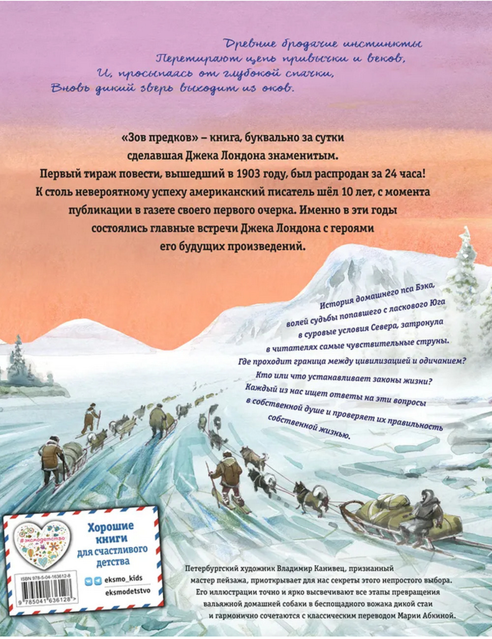 Повесть «Зов предков» принесла своему автору мировую славу. Книга продолжает мини-серию изданий Джека Лондона с иллюстрациями Владимира Канивца. Реалистичные, детальные работы художника великолепно передают контраст между ледяным безмолвием Севера и пылающими эмоциями героев. Читатели высоко оценили предыдущие книги мини-серии («Сказание о Кише. Рассказы» и «Белый клык»).
