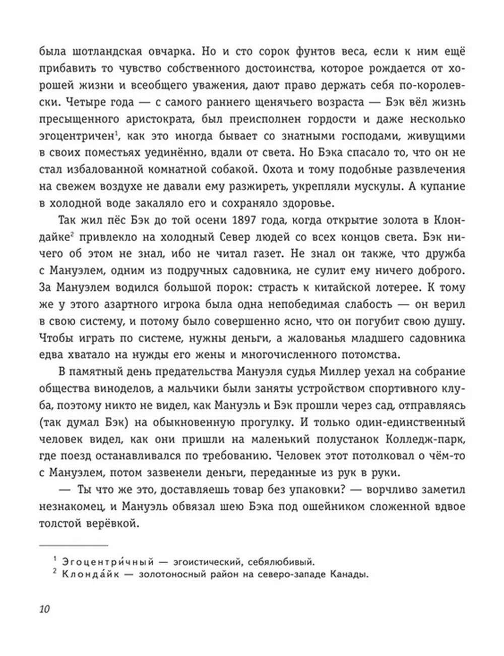 Книга порой кажется рассказанной от лица собаки — настолько точно и подробно писатель передаёт все нюансы происходящего. Не случайно читатели до самой последней страницы остаются на стороне главного героя. В родном поместье Бэк вёл «жизнь пресыщенного аристократа». Её сменила полная лишений, боли и трудностей жизнь вожака собачьей упряжки. И нам предстоит самостоятельно ответить на один из самых актуальных вопросов: что же губительнее для сильной натуры? Пожалуй, этот вопрос время от времени надо задавать себе каждому из нас.