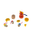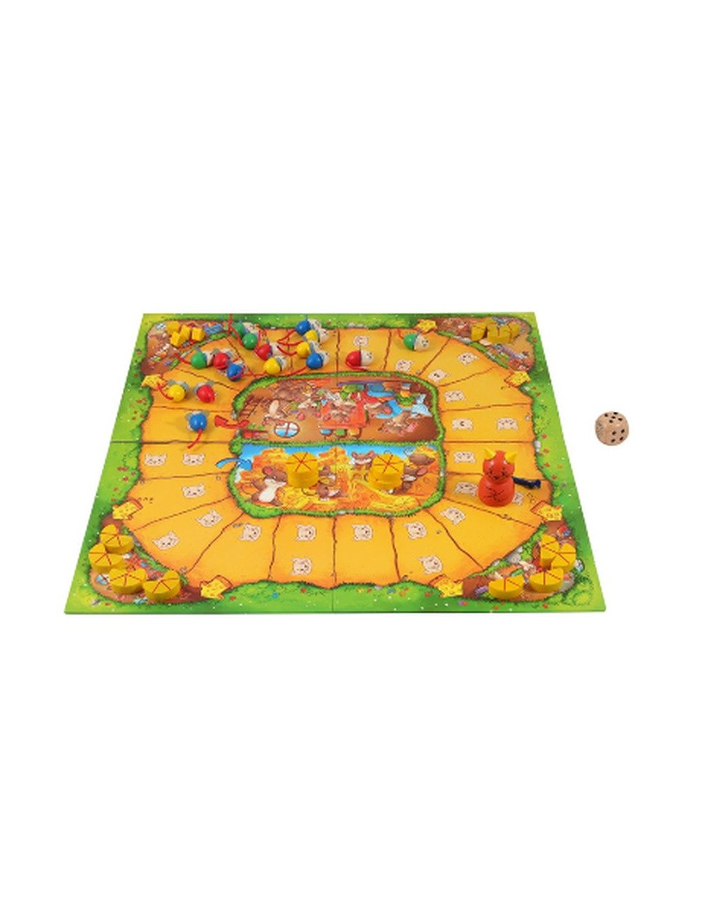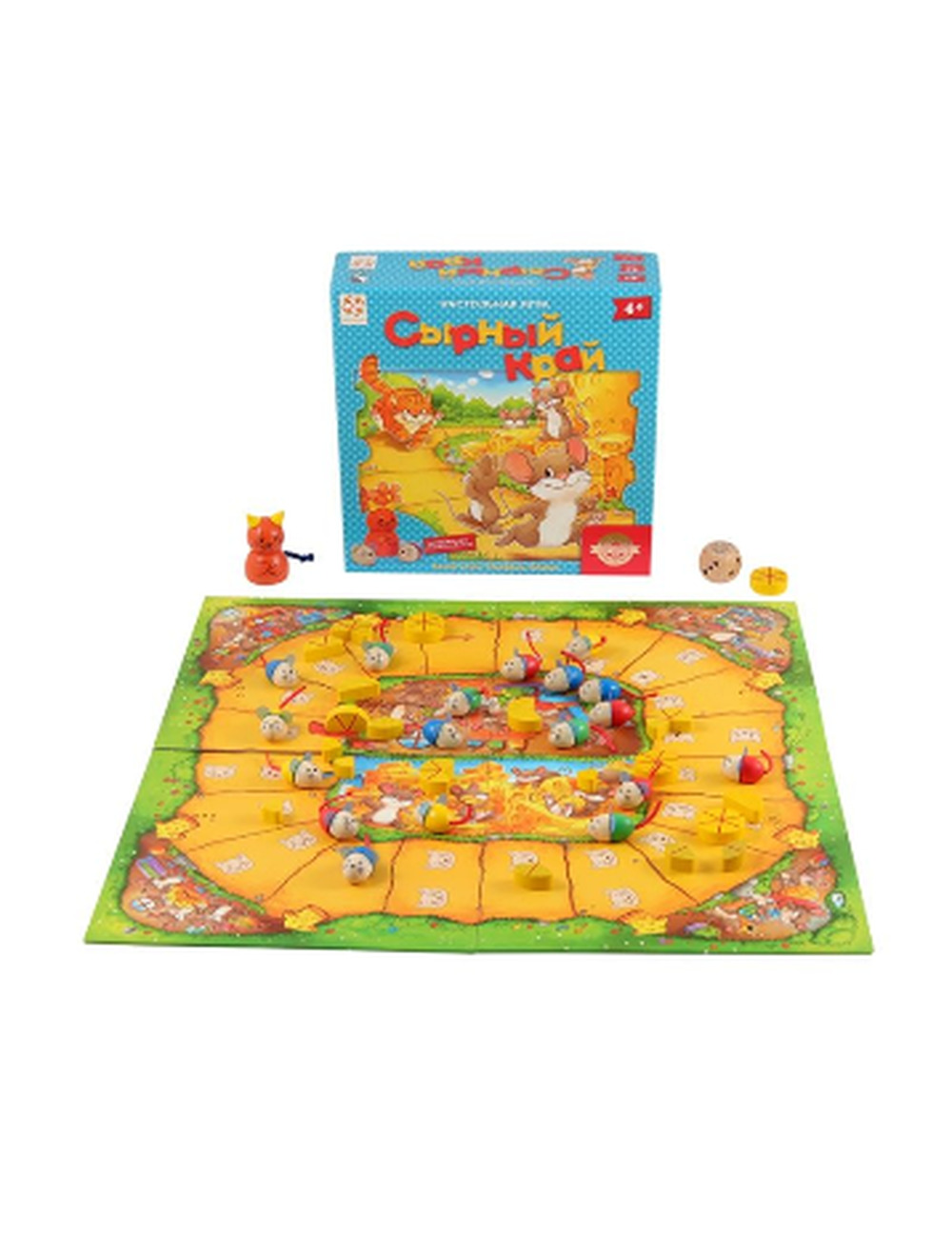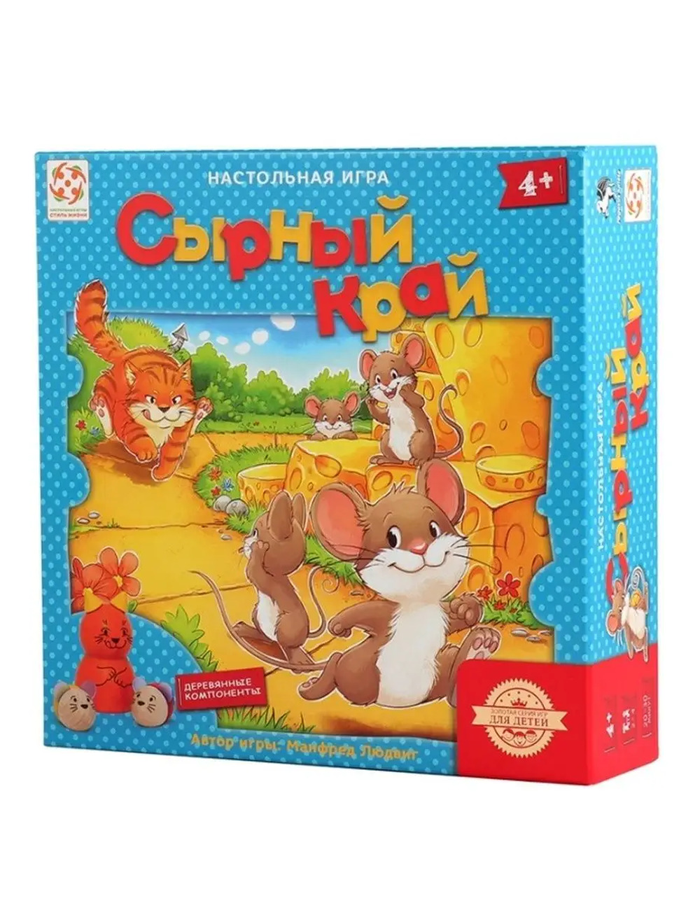 Помогите мышатам пробраться в Сырный край, только берегитесь – сзади может подкрасться кошка! "Сырный край" - сказочная страна, где текут молочные реки и высятся груды сыра всевозможных сортов. Думаете, это какая-то мышиная легенда? Нет, заповедный сырный край существует, и команда храбрых мышат полна решимости добраться до него. Путь туда не близок и опасен – ведь по пятам отважных путешественников уже крадётся голодная кошка! У мышат в настольной игре Сырный край есть небольшая фора – выход из их убежища на дорогу расположен ближе к цели их путешествия, чем клетка, с которой начинает движение кошка. В свой ход игрок может передвинуть одного из своих мышат на столько клеток, на сколько разрешает специальный кубик, а если на кубике выпала кошка - значит, её очередь ходить! Отстающие мышата серьёзно рискуют, скорее уводите их подальше от кошачьих когтей! Не все храбрецы доберутся до заветного сырного края, но вешать носы рано. В каждом из четырёх углов игрового поля расположены норки друзей, куда незадачливый путешественник может свернуть, если дела его совсем плохи. Увы, в этот раз сырные горы остаются для него недостижимой мечтой, но кусочек сыра он всё-таки получит, и чем ближе он подобрался к сырному краю – тем этот кусочек больше. Ну а везунчикам, достигшим цели, достанется в награду по целой головке. В конце партии, когда все мышата либо доберутся до сырного края, либо сойдут с дистанции, победителем объявляется команда мышей, собравшая больше всех сырных долек. Настольная игра Сырный край – это забавная и увлекательная гонка для малышей от четырёх лет. Все компоненты: симпатичные разноцветные мышки, коварно улыбающаяся кошка, сырные награды и крупный кубик – выточены из дерева и так и просятся в руки. А на примере поделенных на дольки сырных головок можно тренировать с дошкольниками устный счёт и даже объяснять дроби. Сможете удрать от кошки и привести свою мышиную команду к победе? Тогда вперёд – к сырному краю! В состав игры входят: 18 мышат (5 синих, 5 красных, 4 зелёных и 4 жёлтых), 1 кошка, 20 кусочков сыра (по 4 каждого из размеров: 1, 2, 3, 4 дольки и целые головки), игровое поле, деревянный кубик. Нейропсихологи рекомендуют настольную игру Сырный край, она хорошо тренирует навык перераспределения внимания и способствует развитию стратегического мышления у детей.