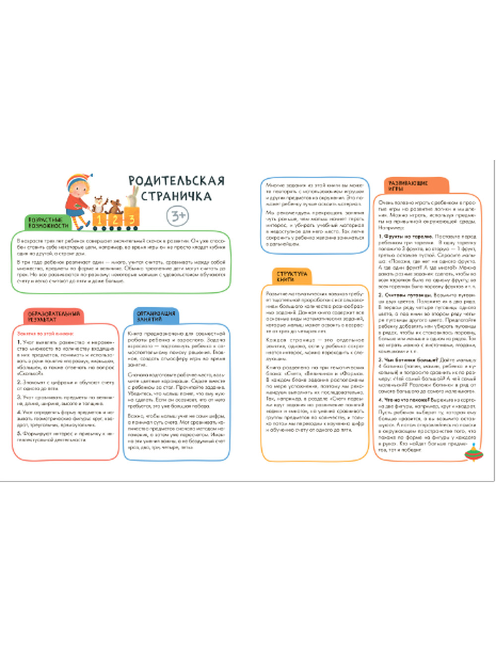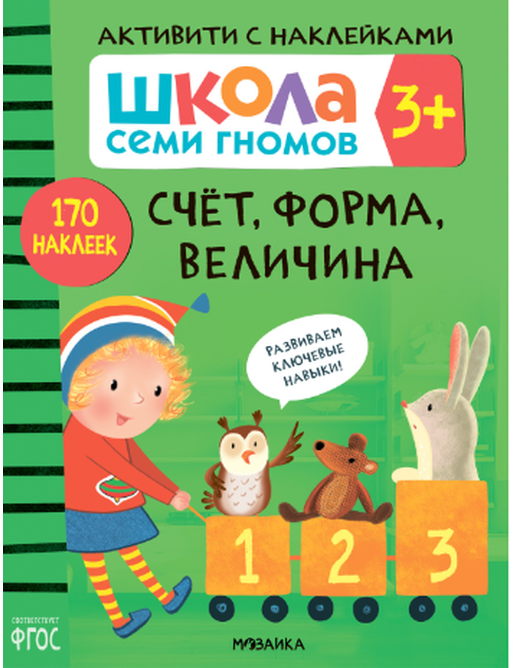 Книга «Счет, форма, величина 3+» из серии «Школа Семи Гномов. Активити с наклейками» предназначена для формирования и развития у детей от 3 до 4 лет элементарных математических представлений, способности измерять величину предметов, определять их форму.