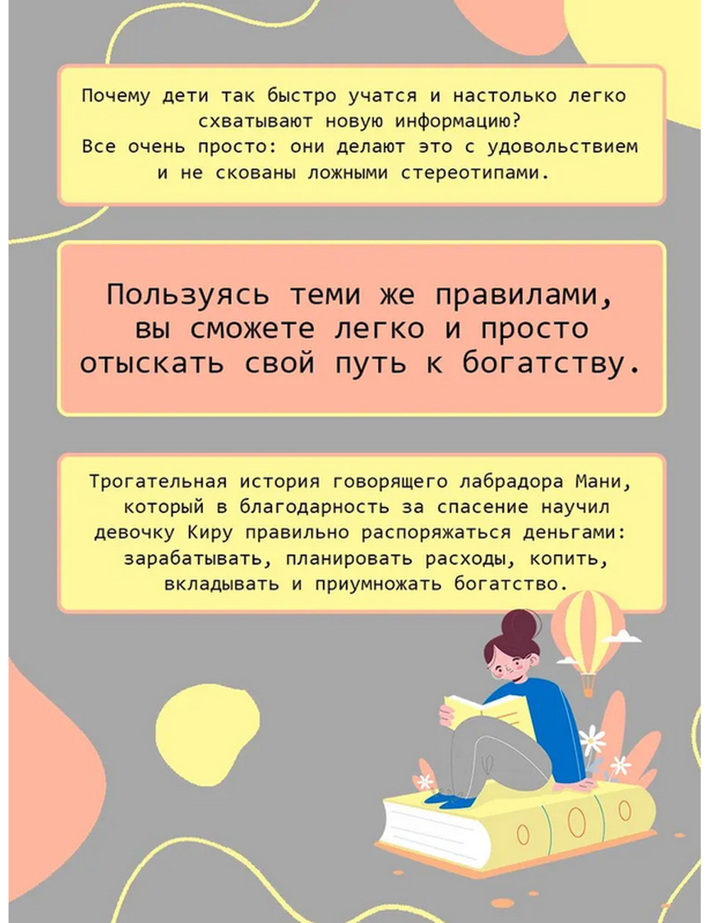Почему дети так быстро учатся и настолько легко схватывают новую информацию? Все очень просто: они делают это с удовольствием и не скованы ложными стереотипами. Пользуясь теми же правилами, вы сможете легко и просто отыскать свой путь к богатству. Трогательная история говорящего лабрадора Мани, который оказался настоящим финансовым гением, в доступной форме открывает перед детьми и взрослыми секреты денег.
