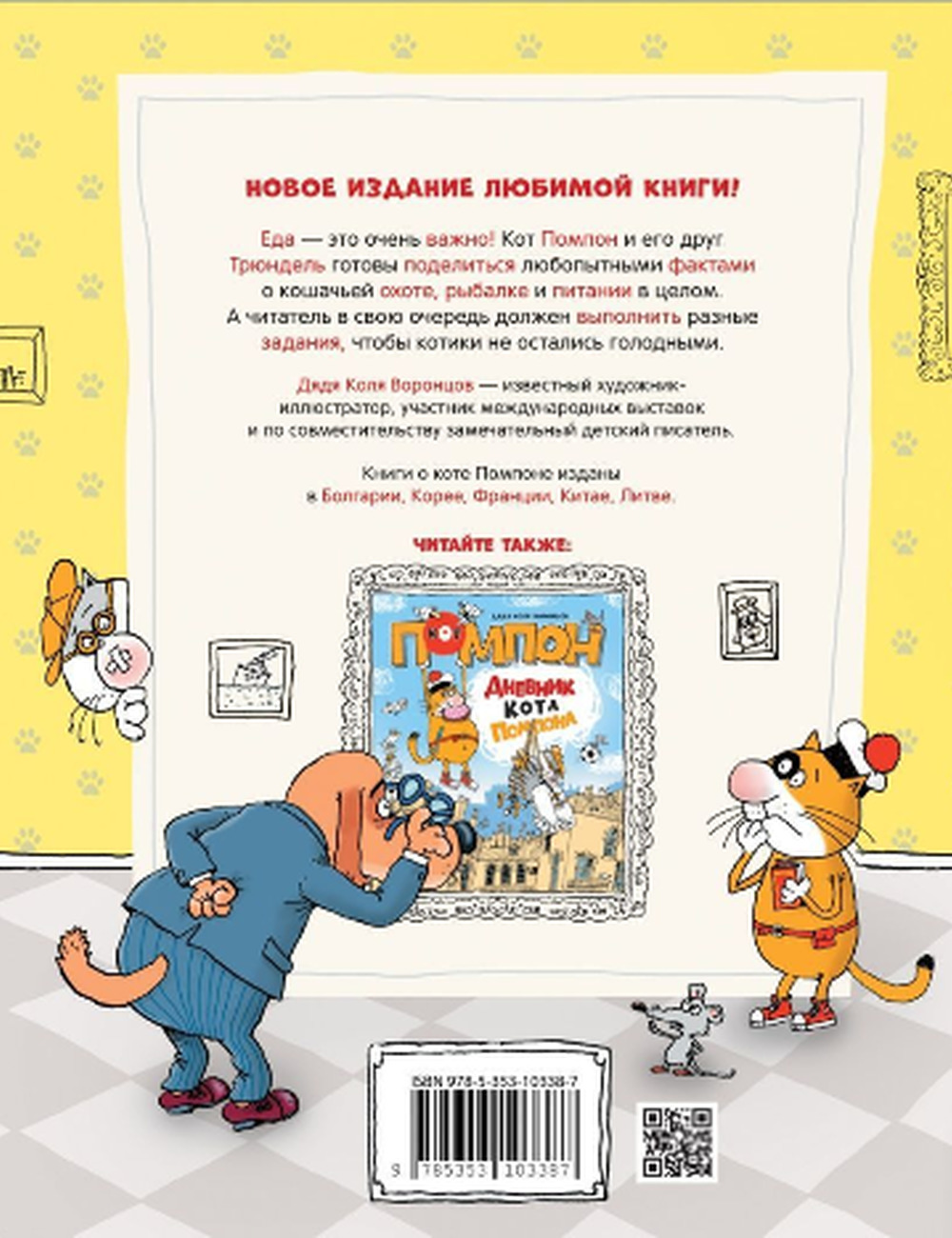 Продолжение легендарного бестселлера современной литературы для детей! Самый известный персонаж российского художника-иллюстратора и детского писателя дяди Коли Воронцова – кот Помпон – возвращается в новом издании! Кот Помпон остается верен себе и снова дает читателю полезные и иногда озорные советы, учит тренировать наблюдательность и логику, рисовать и разгадывать загадки. Чудесное издание для семейного досуга, которое сближает поколения! Эта книга порадует ребят увлекательными историями об очень важном аспекте кошачьей жизни – питании, охоте и рыбалке! Еда – это очень важно! Это вам подтвердит любой кот. Только самостоятельным и независимым котам еда достается непросто. Почему-то никто ее не приносит на тарелочке с голубой каемочкой. Вот и приходится им бегать, прыгать, нырять, охотиться и хитрить, чтобы добыть вкусный обед. Кот Помпон вместе со своим закадычным другом Трюнделем поделится некоторыми советами и хитростями, которые будут полезны всем голодным котам (и даже детям). А еще закадычные друзья предложат юным читателям порисовать, посочинять, пройти несколько лабиринтов и даже поиграть в свою любимую игру – «Обжорский бой»! Эта книга станет настоящей палочкой-выручалочкой для родителей, которые хотят привить ребенку любовь к книгам и чтению. «Книга о вкусной и шустрой еде кота Помпона» больше похожа на комикс: каждую страницу украшают чудесные, забавные иллюстрации дяди Коли Воронцова с не менее озорными заметками на полях. Совместное чтение способствует гармоничному эмоциональному развитию детей, а обсуждение сюжетов поможет познакомить ребенка с правилами КОТОохоты и КОТОрыбалки, развить чувство юмора и любовь к книгам. Мур-мяу!