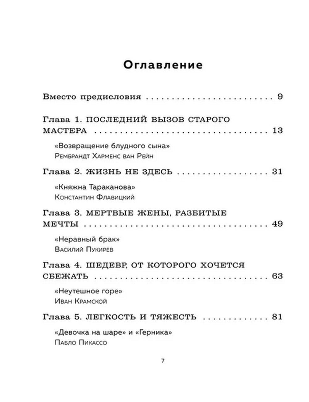 В книге подробно разобраны 13 знаковых полотен: "Грачи прилетели" Алексея Саврасова, "Демон сидящий" Михаила Врубеля, "Распятие" Николая Ге, "Девочка на шаре" Пабло Пикассо, "Неравный брак" Василия Пукирева, "Девятый вал" Ивана Айвазовского и др. Рассмотреть картины можно на цветных репродукциях.