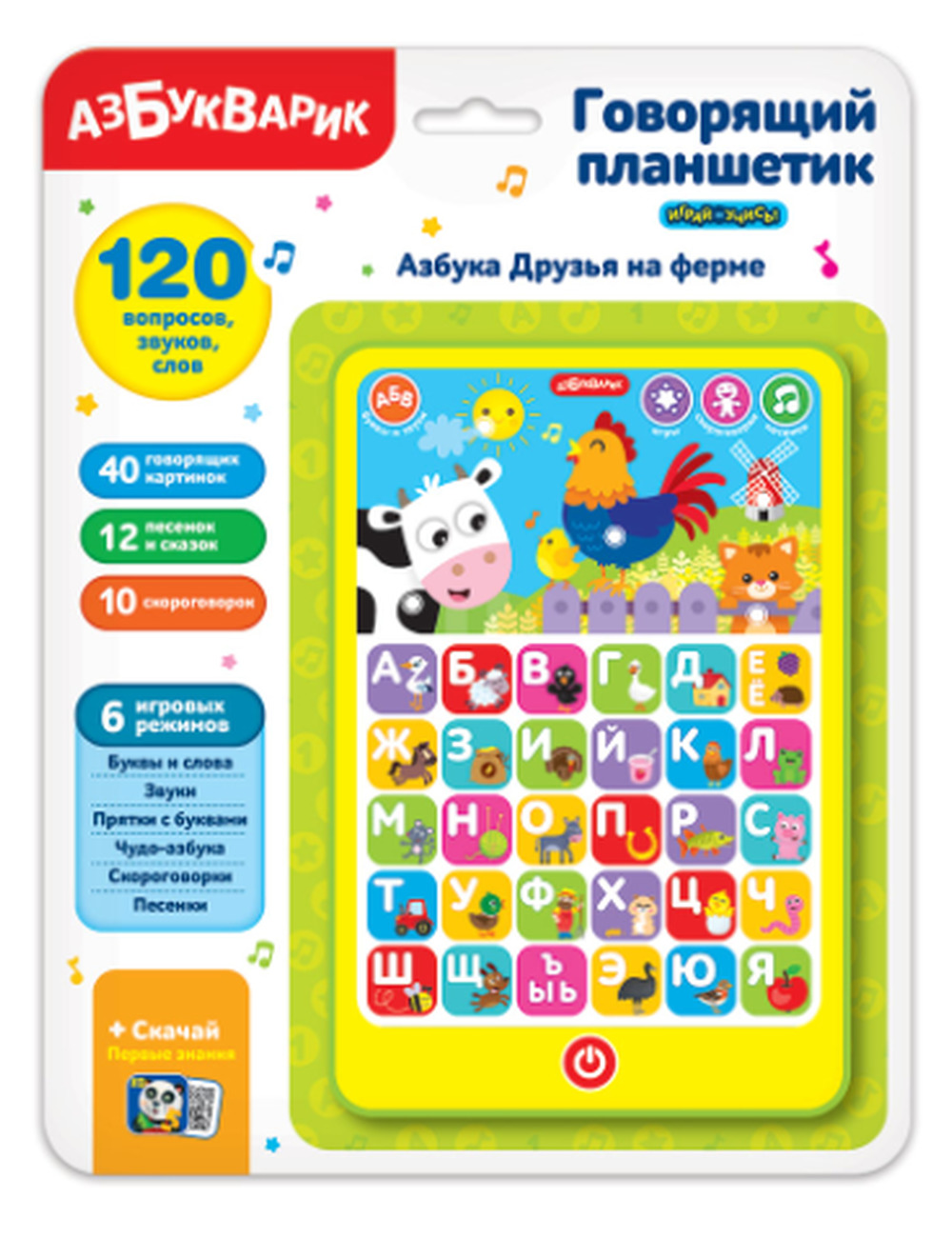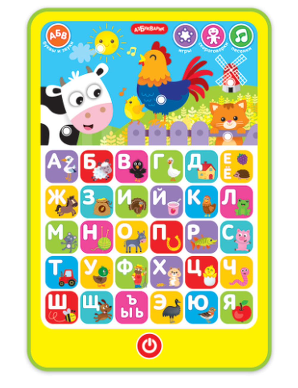 С этим обучающим планшетиком «Азбука Друзья на ферме» ребёнок быстро выучит алфавит и домашних животных. Ведь для каждой буквы в игрушке подобрано свое животное: Г – гусь, Ж – жеребенок, К – курица… Учиться можно в двух режимах: «Буквы» и «Звуки».
