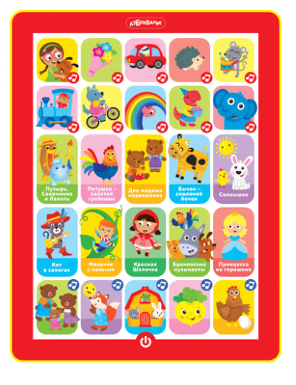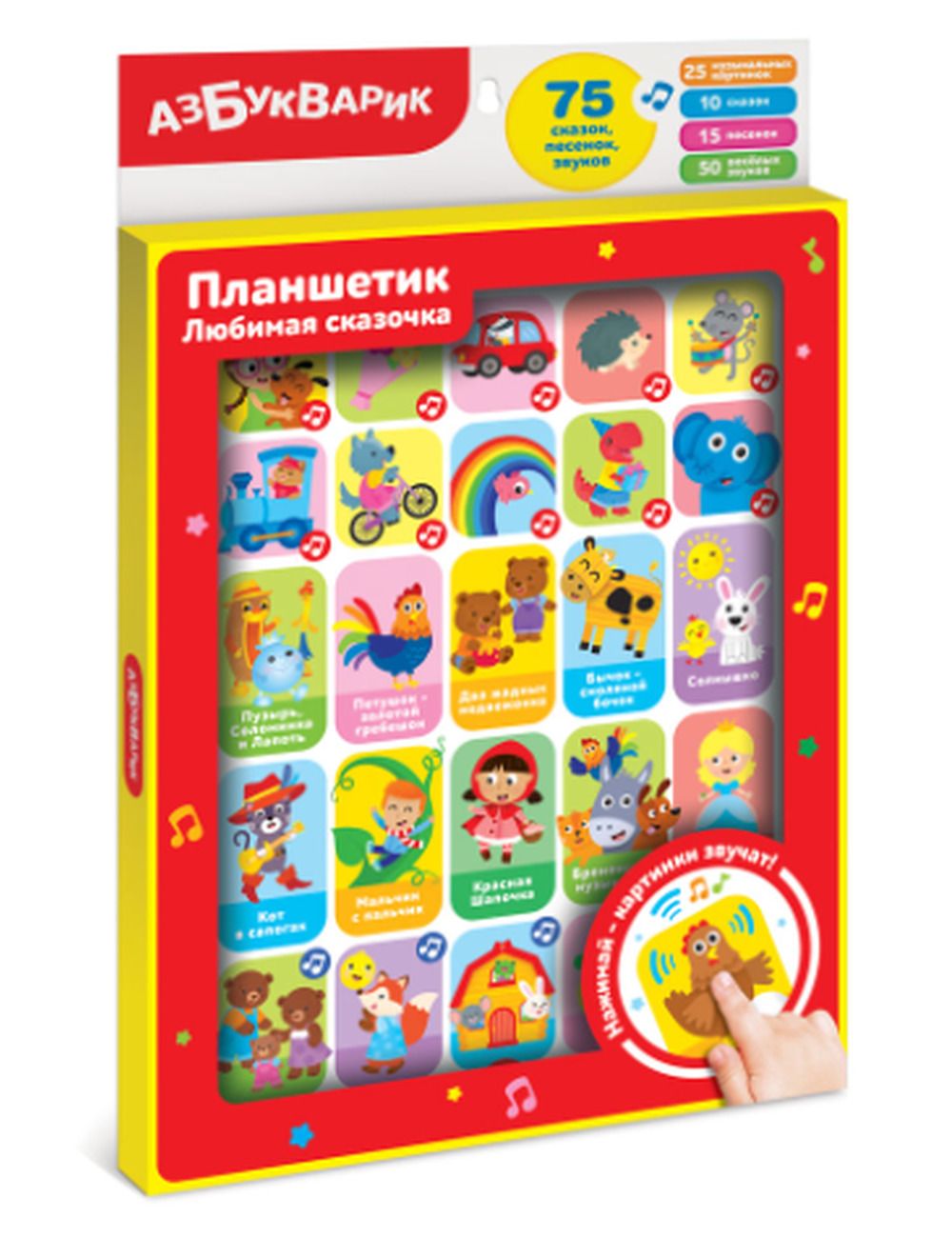 С новым говорящим и музыкальным планшетиком скучать не придётся! Ведь в нём есть и любимые народные сказки («Пузырь, Соломинка и Лапоть», «Петушок – золотой гребешок», «Два жадных медвежонка», «Бычок – смоляной бочок», «Солнышко»), и сказки известных писателей («Кот в сапогах», «Мальчик с пальчик», «Красная Шапочка», «Бременские музыканты», «Принцесса на горошине»), и весёлые детские хиты («Барбарики», «Мамочка», «Бибика», «Бум-Бум», «Чуку-чу» и др.), и даже сказки-песенки («Три медведя», «Колобок», «Теремок», «Репка», «Курочка Ряба»). Всего в планшетике 25 песенок, сказок, стихов, а также множество веселых звуков и голосов зверят. Все картинки звучат!