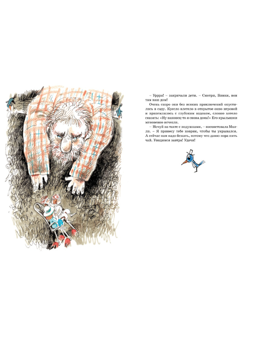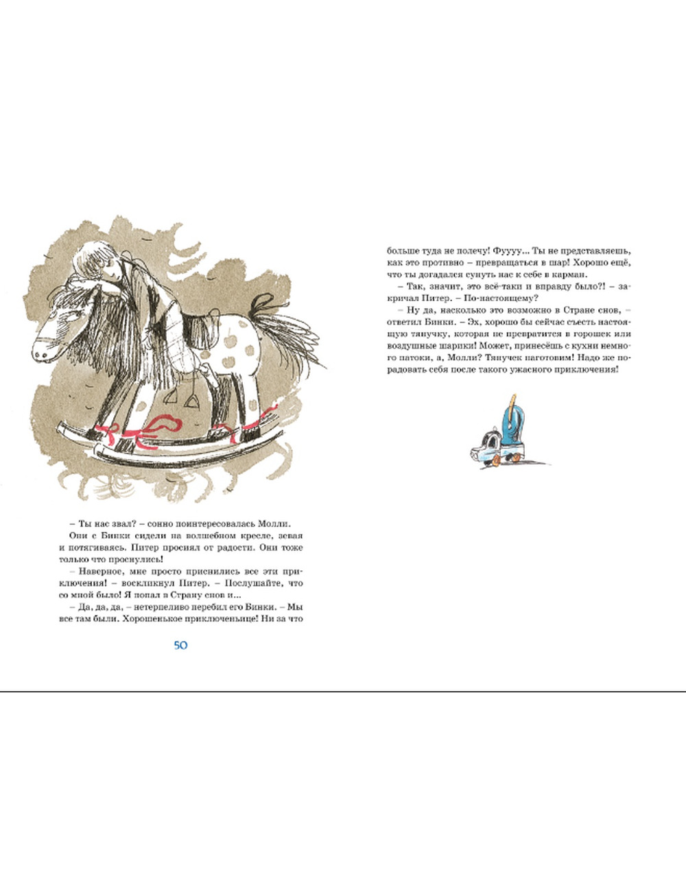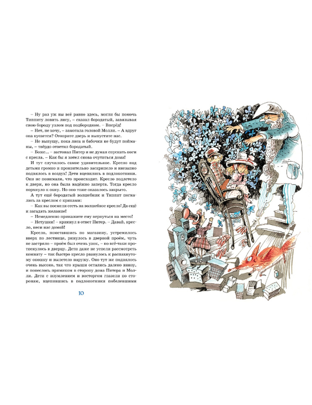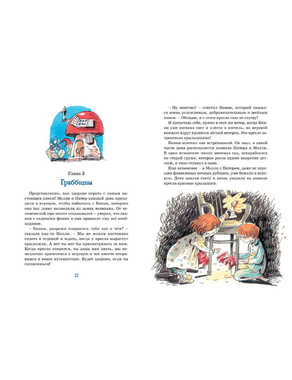 У Молли и Питера – главных героев книги – появилась тайна, самая удивительная и чудесная тайна на свете! В их игровой комнате стоит волшебное кресло, которое в любой момент может отрастить крылышки и перенести своих юных хозяев, куда только они пожелают! Дети посетят замок великана и Исчезающий остров, побывают в гостях у волшебника Хо-Хо и у колдуньи Сниппит… Много-много всего интересного и удивительного ждёт их! А путешествовать Молли и Питер будут вместе со своим замечательным другом – смешным и добрым пикси по имени Бинки.
