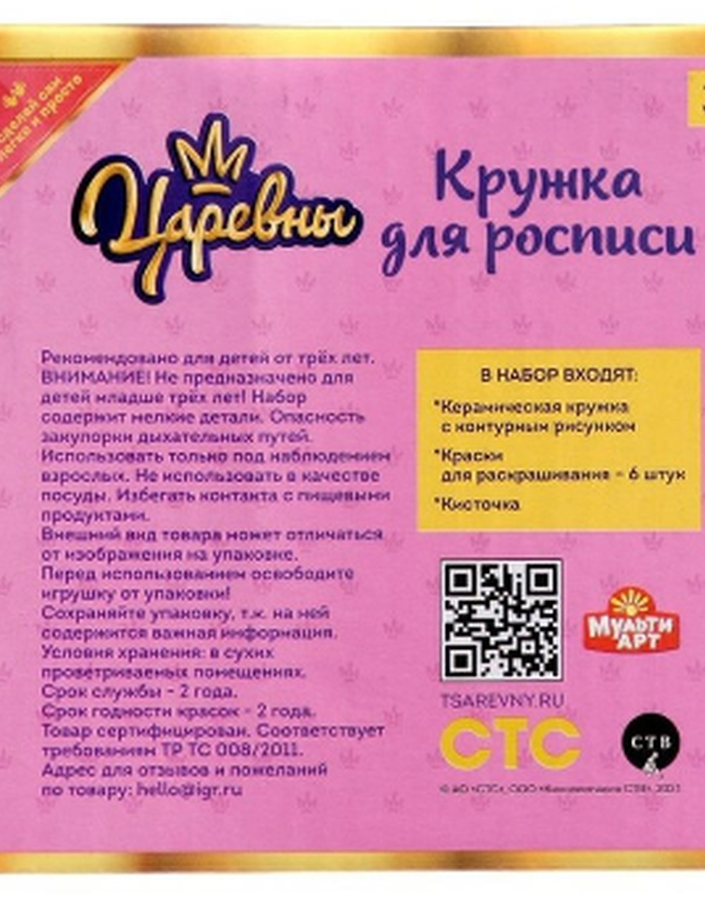 Кружка для росписи "Царевны" краски, кисточка. Состав: Керамика, краска, кисть. Размер упаковки: высота 10 см., ширина 10 см., глубина 10 см. Упаковка: Цветная картонная коробка. Дополнительное описание: Объём кружки - 300 мл.