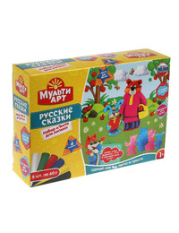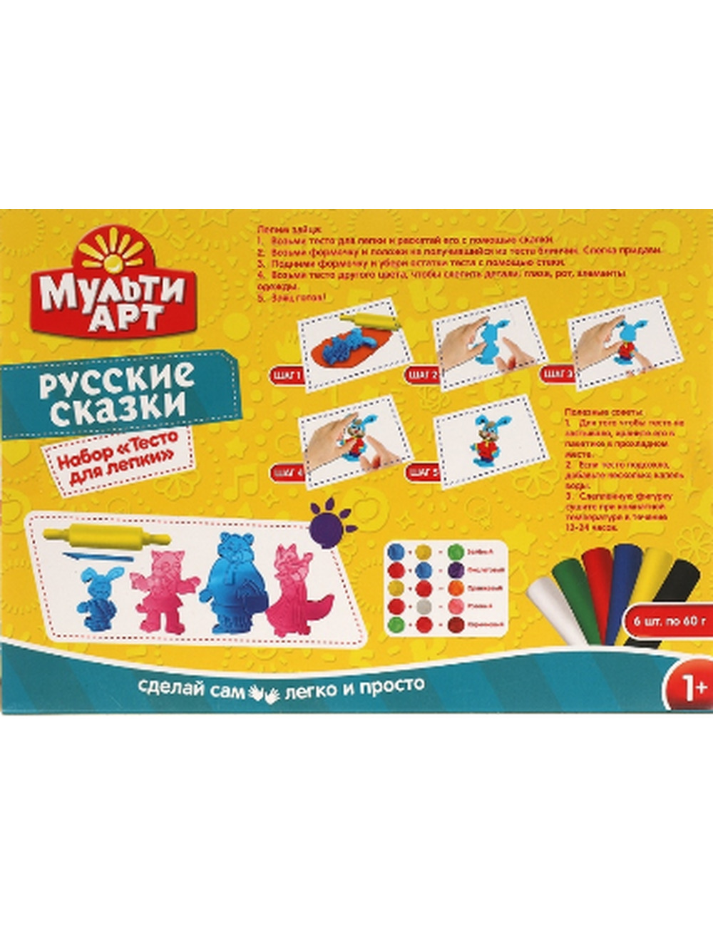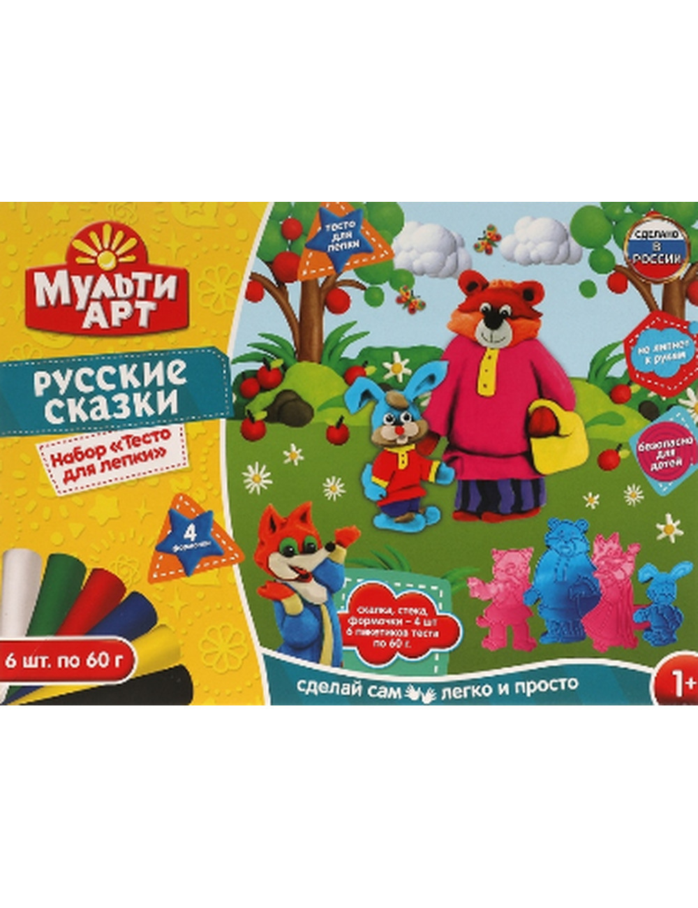 Набор для лепки со специальным тестом и формочками "Русские сказки" ТМ "Мульти Арт" отличный вариант для развития творческих способностей ребёнка:- 6 цветов- 4 формочки в комплекте- стек и скалка в комплекте- не липнет к рукам- безопасно для детей- инструкция по созданию персонажа на обороте упаковки- подсказка по смешиванию цветов на обороте упаковкиИспользуя тесто из набора, малыш сможет увлекательно провести время, самостоятельно или при помощи родителей вылепливая разнообразные поделки. А разнообразные формочки сделают игры с тестом ещё интереснее.Игра с тестом для лепки ТМ "" знакомит ребёнка с формами и цветами и развивает:- мелкую моторику- координацию движений- воображение и фантазию- творческое мышлениеРазмер упаковки: 6 х 24 х 17 см. Объём: по 60 гр. теста каждого цвета.Рекомендовано детям от 1 года.