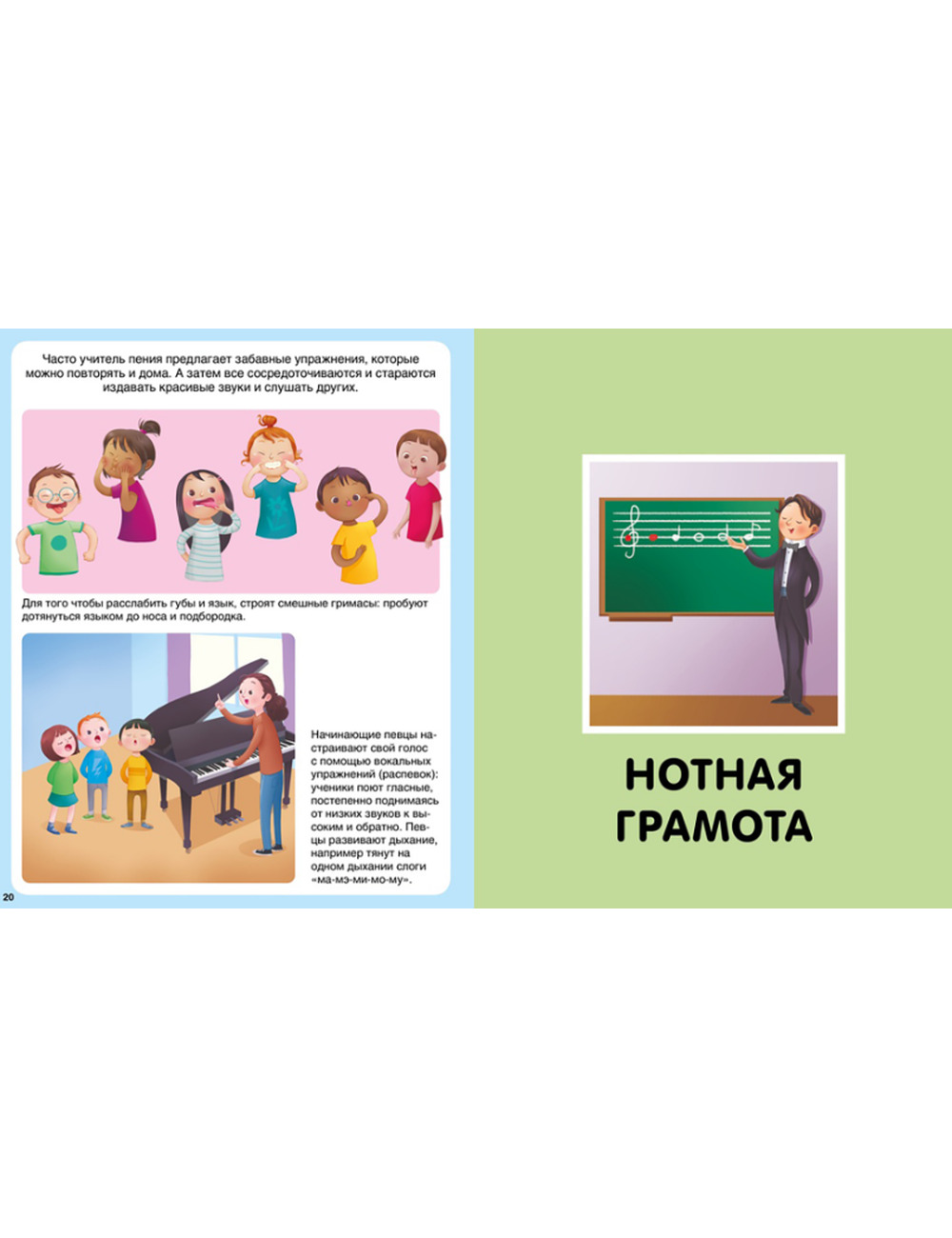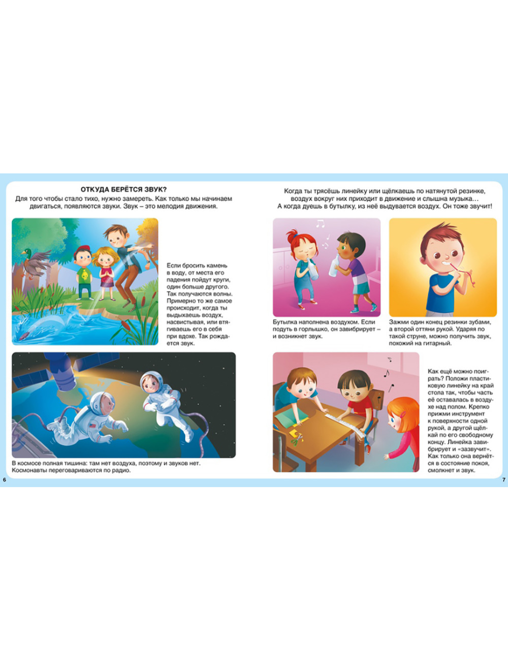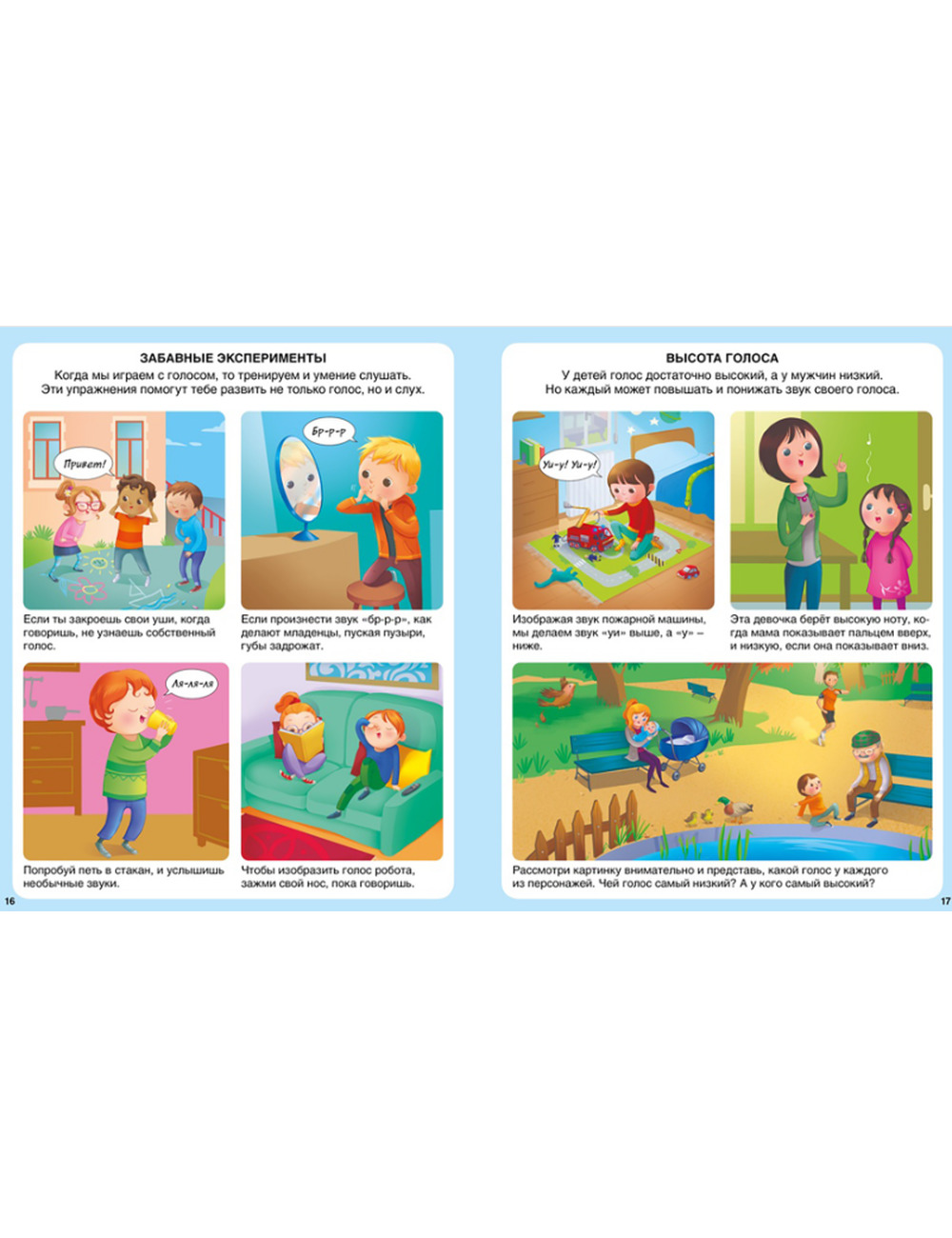 Ты поймёшь, почему мы слышим звуки и благодаря чему можем говорить и петь, потренируешься управлять своим голосом, изучишь основы нотной грамоты, узнаешь, что представляют из себя музыкальные направления, познакомишься с различными видами инструментов и… даже сможешь изготовить свой! А ещё тебя ждут любопытные опыты со звуком и занимательные игры и задания, которые помогут проверить полученные знания.