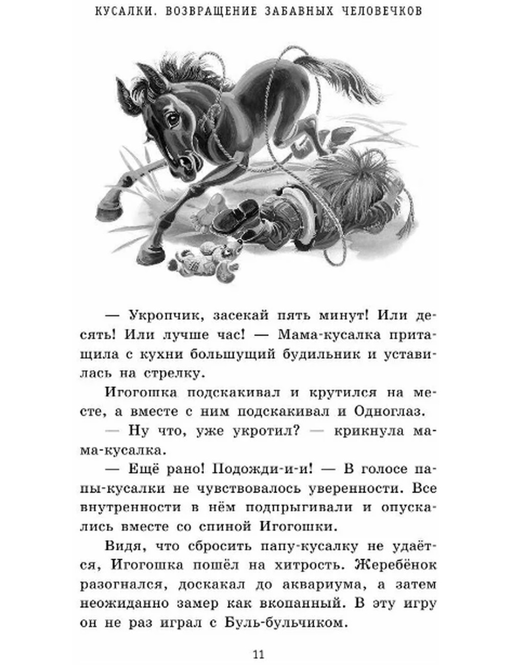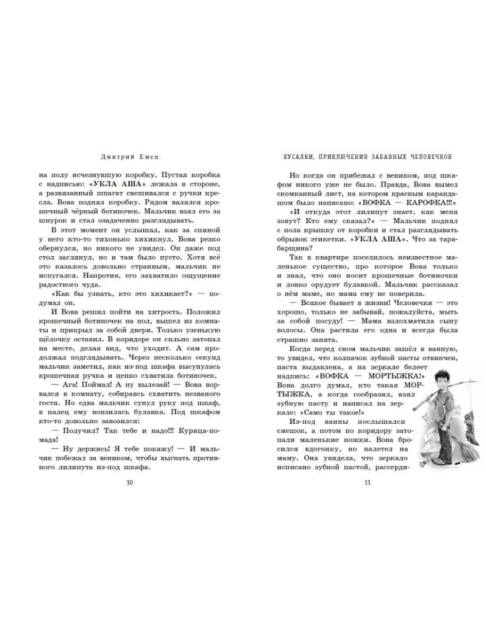Чудеса происходят не каждый день, но если уж начинают случаться, то их уже не остановишь. Вот и у Вовы произошло не одно, а сразу несколько удивительных событий! Сначала он познакомился с крошечной девочкой-куклой Дашей, затем узнал, что в его аквариуме живет самый настоящий водяной Буль-бульчик. А ещё в его комнате за батареей поселились забавные человечки — ?кусалки. И не просто поселились, а стали вовсю хозяйничать. То съедят все консервы, то стащат у водяного волшебную книгу… И ведь никак их не угомонишь! Как же Вове справиться с проказливыми человечками? Может, кукла Даша и водяной Буль-бульчик помогут ему в этом?
