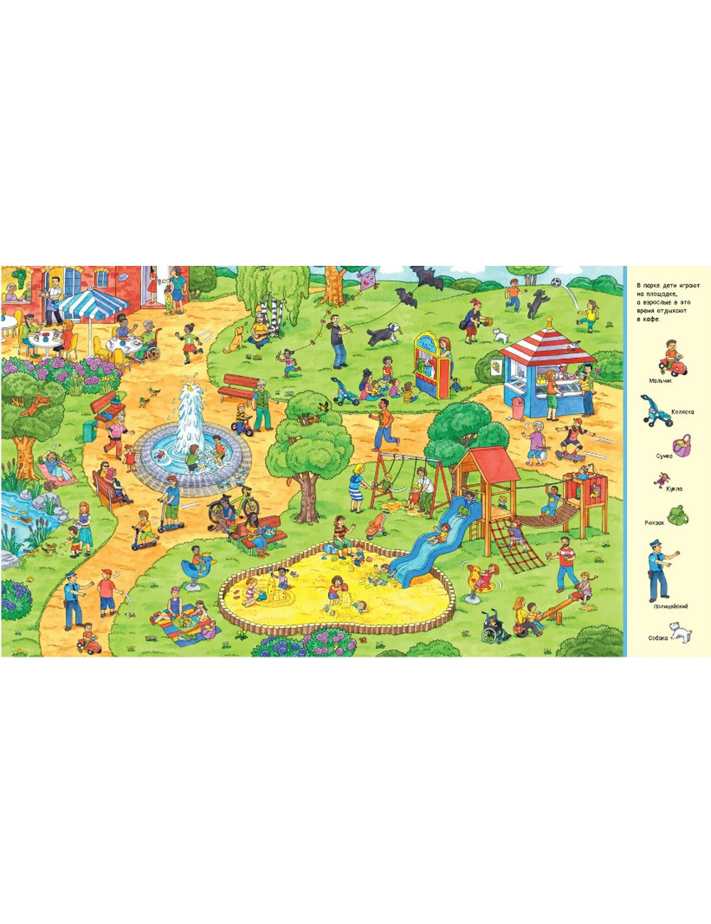 Вместе с любимыми героями ребёнок совершит увлекательную прогулку по самым разным детским площадкам: попрыгает на батуте, скатится с горки в аквапарке и даже поможет потерявшемуся малышу найти маму. Виммельбух — это отличная тренировка логики, внимательности и усидчивости, а ещё развитие фантазии и речи. Яркие большие иллюстрации с кучей деталей и задания на поиск предметов увлекут ребёнка и пробудят в нём любопытство.