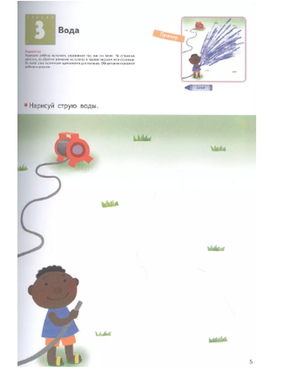 "Эта тетрадь направлена на обучение навыку работы с восковым карандашом и развитие мелкой моторики. Кроме того, малыш запомнит названия цветов и потренируется создавать простые рисунки.